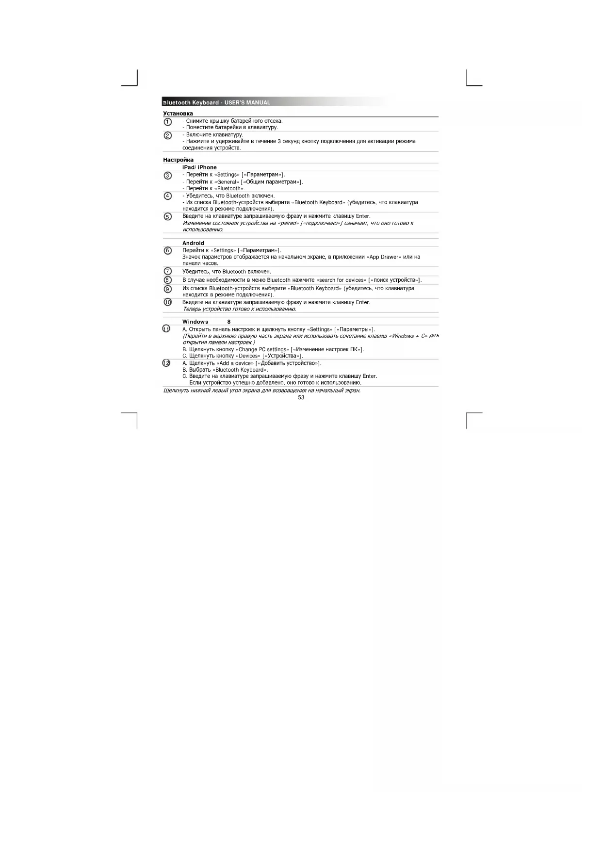 iPad/iPhone - Перейти к «Settings» [«Параметрам»]. - Перейти к «General» [«Общим параметрам»]. - Перейти к «Bluetooth». - Убедитесь, что Bluetooth включен. - Из списка Bluetooth-устройств выберите «Bluetooth Keyboard» (убедитесь, что клавиатура находится в режиме подключения). Введите на клавиатуре запрашиваемую фразу и нажмите клавишу Enter. Изменение состояния устройства на «paired» [«подключено»] означает, что оно готово к использованию. Android Перейти к «Settings» [«Параметрам»]. Значок параметров отображается на начальном экране, в приложении «App Drawer» или на панели часов. Убедитесь, что Bluetooth включен. В случае необходимости в меню Bluetooth нажмите «search for devices» [«поиск устройств»]. Из списка Bluetooth-устройств выберите «Bluetooth Keyboard» (убедитесь, что клавиатура находится в режиме подключения). 10 Введите на клавиатуре запрашиваемую фразу и нажмите клавишу Enter. Теперь устройство готово к использованию. Windows 8 11 A. Открыть панель настроек и щелкнуть кнопку «Settings» [«Параметры»]. (Перейти в верхнюю правую часть экрана или использовать сочетание клавиш «Windows + C»