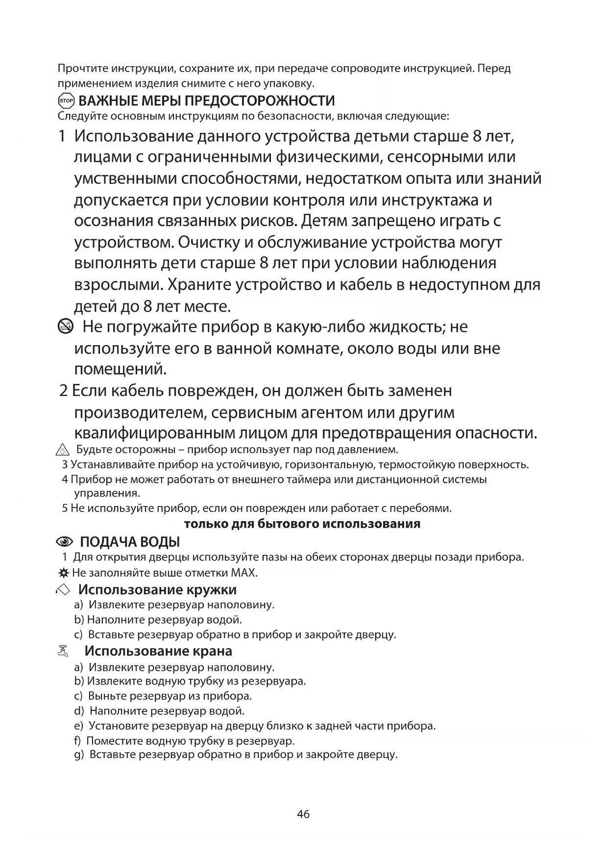 o Будьте осторожны – прибор использует пар под давлением.