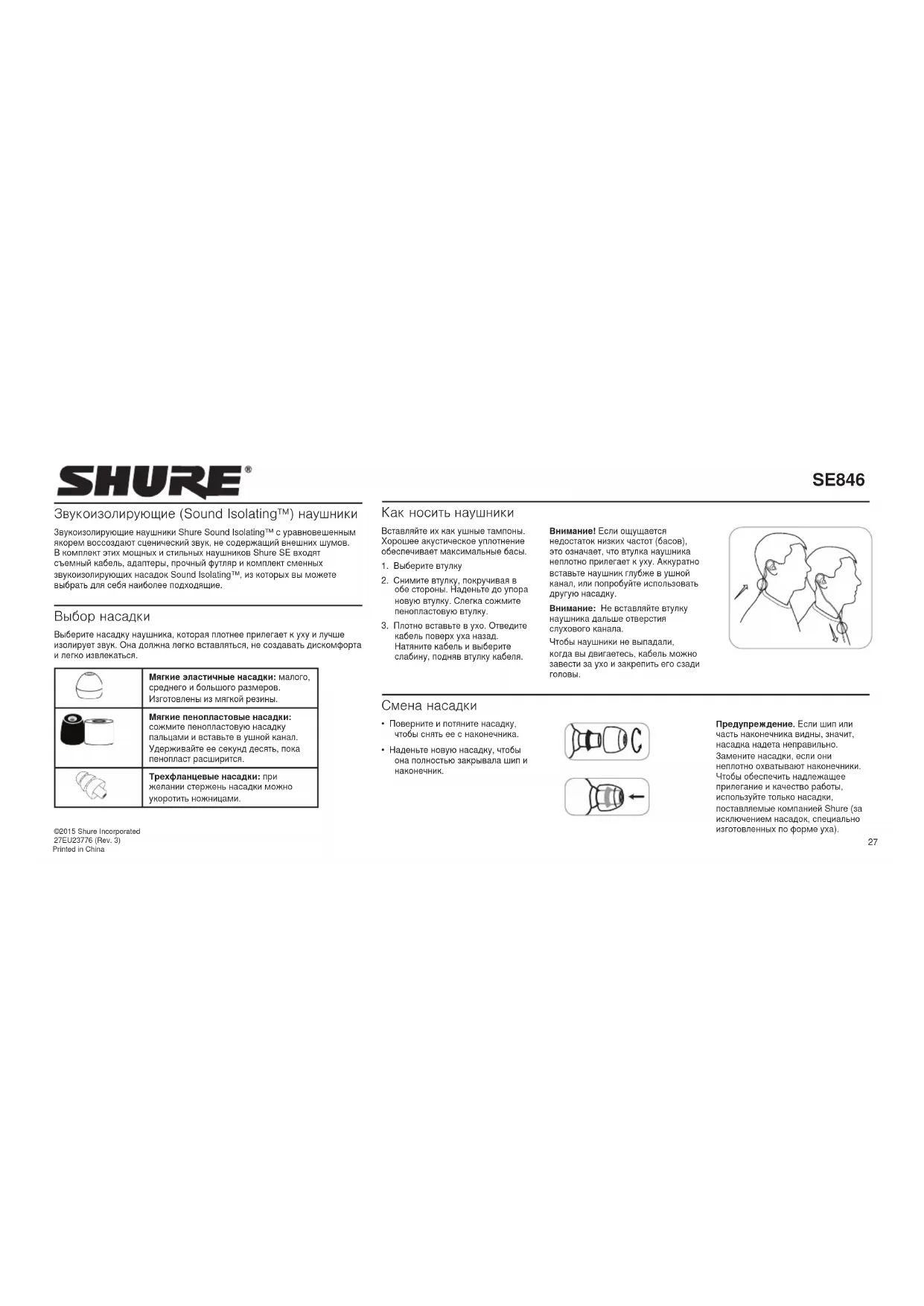 - Наденьте новую насадку, чтобы она полностью закрывала шип и наконечник. Предупреждение. Если шип или часть наконечника видны, значит, насадка надета неправильно. Замените насадки, если они неплотно охватывают наконечники. Чтобы обеспечить надлежащее прилегание и качество работы, используйте только насадки, поставляемые компанией Shure (за исключением насадок, специально изготовленных по форме уха). ©2015 Shure Incorporated 27EU23776 (Rev. 3) Printed in China28 Как извлечь наушники Возьмитесь за корпус наушника, слегка поверните и выньте из уха. Примечание. Если нужно снять наушник, не тяните за