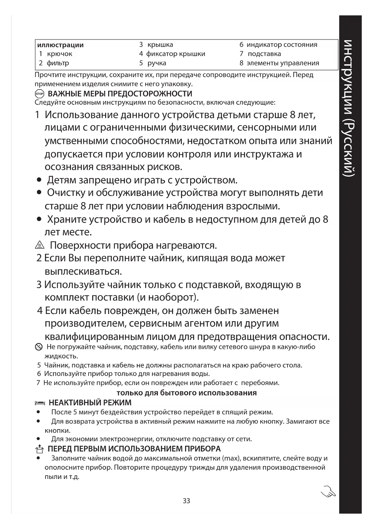 18 Для сброса защитного предохранителя снимите чайник с подставки и дайте ему остыть;