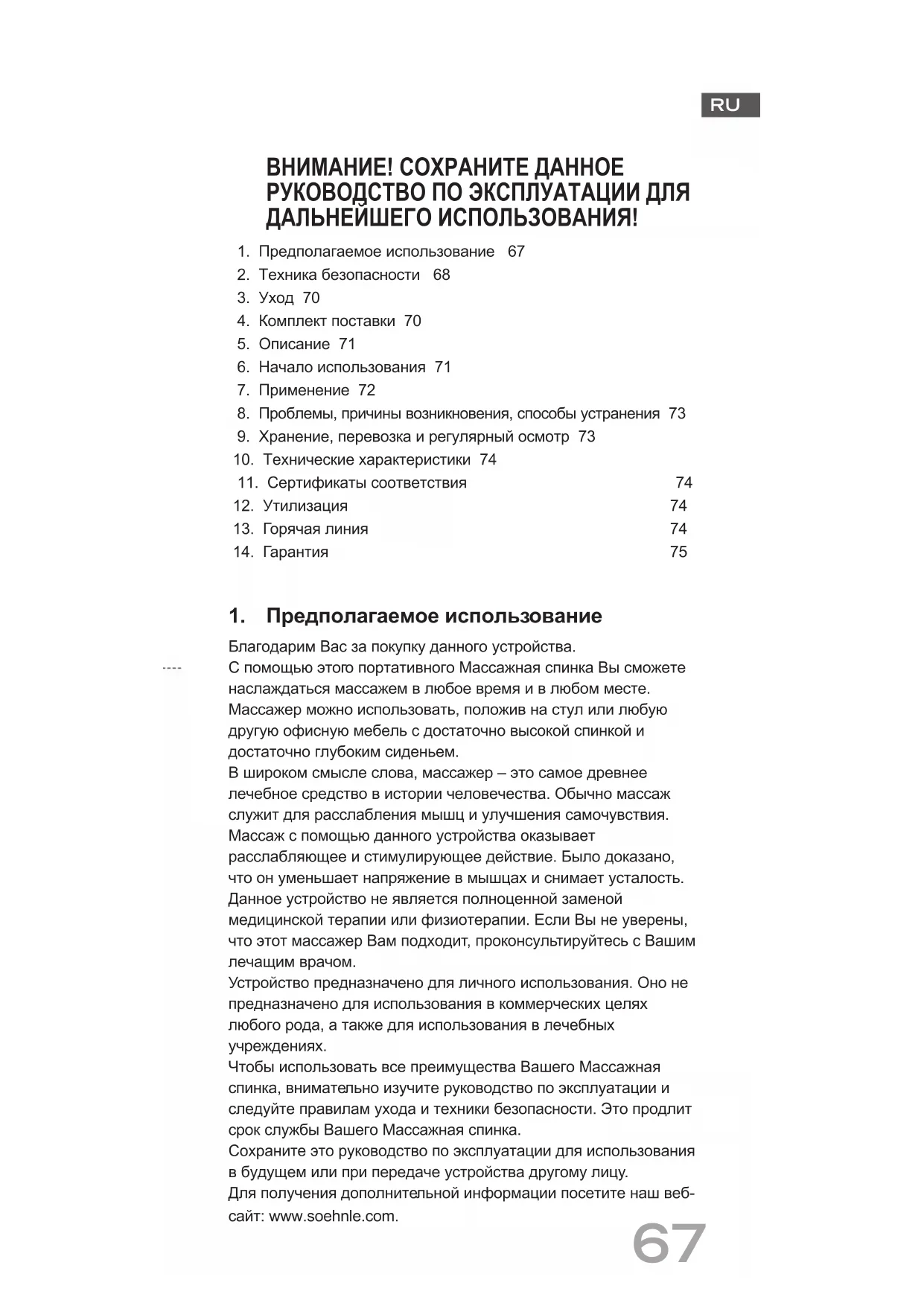 Благодарим Вас за покупку данного устройства. С помощью этого портативного Массажная спинка Вы сможете наслаждаться массажем в любое время и в любом месте. Массажер можно использовать, положив на стул или любую другую офисную мебель с достаточно высокой спинкой и достаточно глубоким сиденьем. В широком смысле слова, массажер – это самое древнее лечебное средство в истории человечества. Обычно массаж служит для расслабления мышц и улучшения самочувствия. Массаж с помощью данного устройства оказывает расслабляющее и стимулирующее действие. Было доказано, что он уменьшает напряжение в мышцах и снимает усталость. Данное устройство не является полноценной заменой медицинской терапии или физиотерапии. Если Вы не уверены, что этот массажер Вам подходит, проконсультируйтесь с Вашим лечащим врачом. Устройство предназначено для личного использования. Оно не предназначено для использования в коммерческих целях любого рода, а также для использования в лечебных учреждениях. Чтобы использовать все преимущества Вашего Массажная спинка, внимательно изучите руководство по эксплуатации и следуйте правилам ухода и техники безопасности. Это продлит срок службы Вашего Массажная спинка. Сохраните это руководство по эксплуатации для использования в будущем или при передаче устройства другому лицу. Для получения дополнительной информации посетите наш веб- сайт: www.soehnle.com. ВНИМАНИЕ! СОХРАНИТЕ ДАННОЕ РУКОВОДСТВО ПО ЭКСПЛУАТАЦИИ ДЛЯ ДАЛЬНЕЙШЕГО ИСПОЛЬЗОВАНИЯ!68
