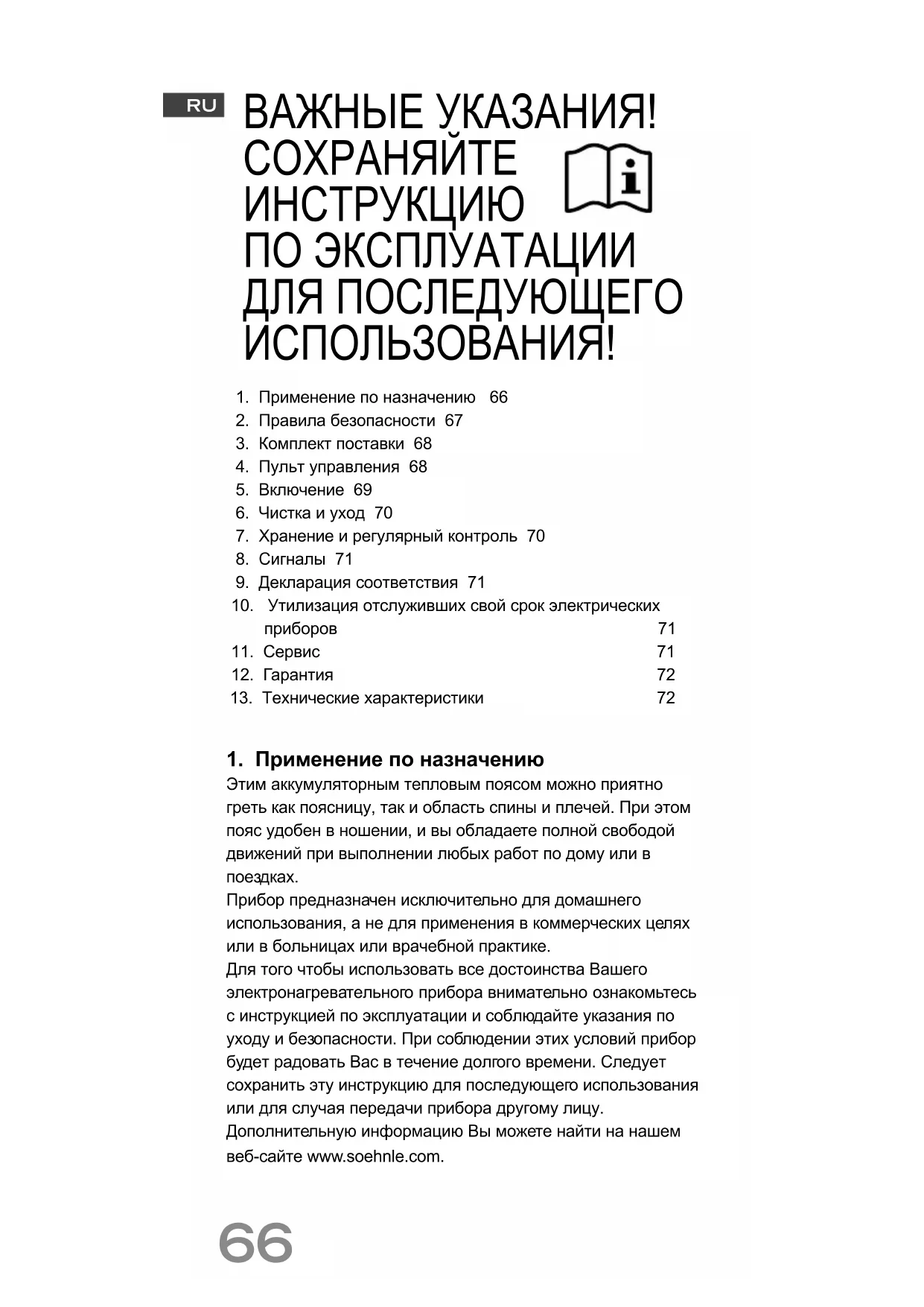 Прибор предназначен исключительно для домашнего использования, а не для применения в коммерческих целях или в больницах или врачебной практике. Для того чтобы использовать все достоинства Вашего электронагревательного прибора внимательно ознакомьтесь с инструкцией по эксплуатации и соблюдайте указания по уходу и безопасности. При соблюдении этих условий прибор будет радовать Вас в течение долгого времени. Следует сохранить эту инструкцию для последующего использования или для случая передачи прибора другому лицу. Дополнительную информацию Вы можете найти на нашем веб-сайте www.soehnle.com.67