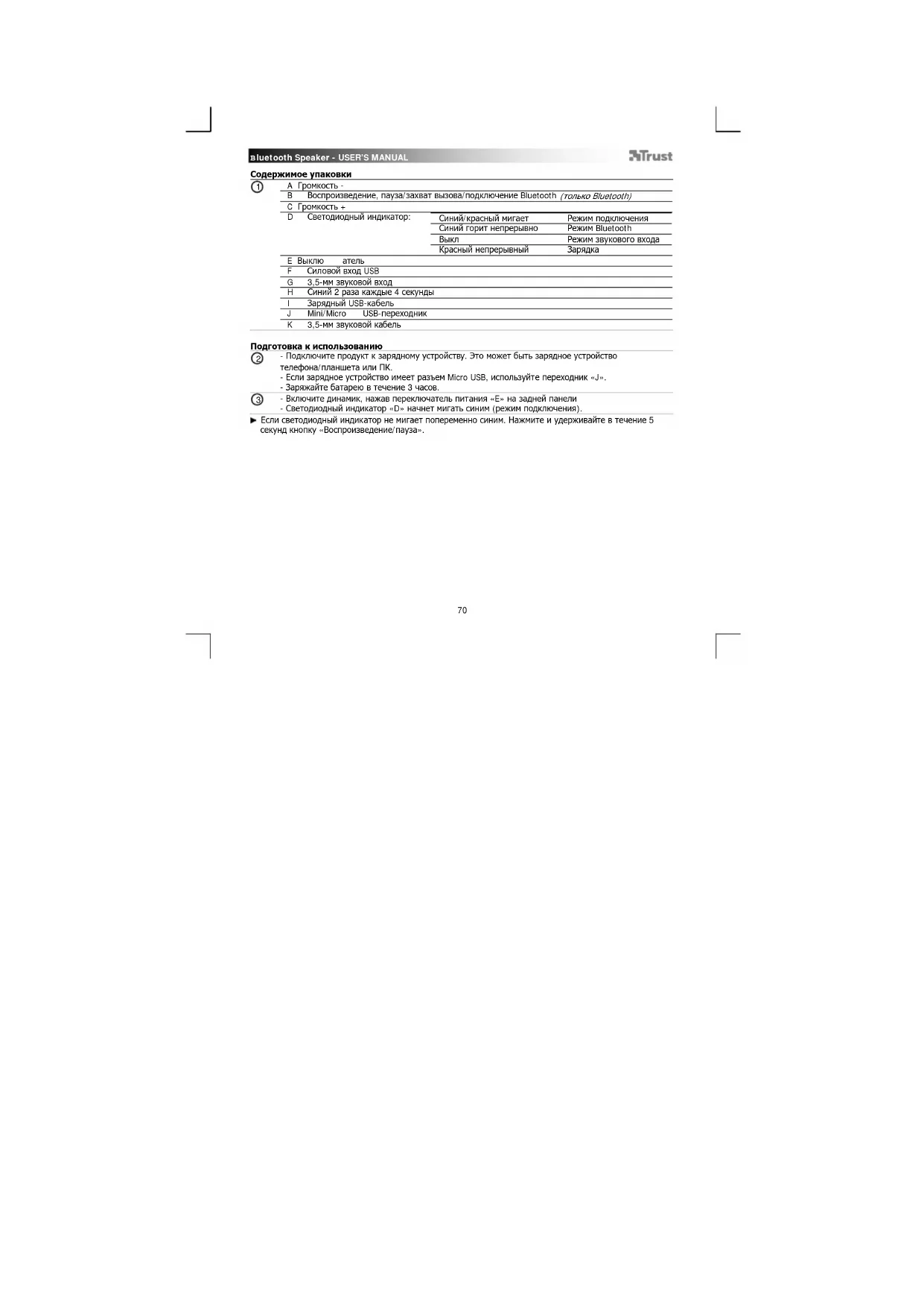 - Убедитесь, что на Вашем устройстве включена функция Bluetooth. - Во время использования Bluetooth убедитесь, что к 3,5-мм звуковому входу звуковой кабель не подключен. - Повторно выполните этапы стандартной конфигурации для Вашего устройства. (iPad/iPhone, Android, Windows, Mac) - Bluetooth-колонки находятся слишком далеко от Вашего устройства. (Максимальное расстояние составляет 10 м при идеальных условиях.) - Если вы используете продукт около больших металлических поверхностей, уберите металлические поверхности или уберите продукт подальше от металлической поверхности. - Стены и пол значительно снижают рабочий диапазон продукта. Переместите Bluetooth-колонки ближе к источнику звукового сигнала. - Уберите Bluetooth-колонки подальше от других беспроводных устройств (Напр., беспроводных сетевых маршрутизаторов, мыши и клавиатуры.) Искаженный звук Уровень звука низкий - Проверьте уровень громкости Вашего устройства (планшета, смартфона, ПК) Если проблема не устранена, обращайтесь в справочную службу www.trust.com/19275/faqBluetooth Speaker - USER’S MANUAL