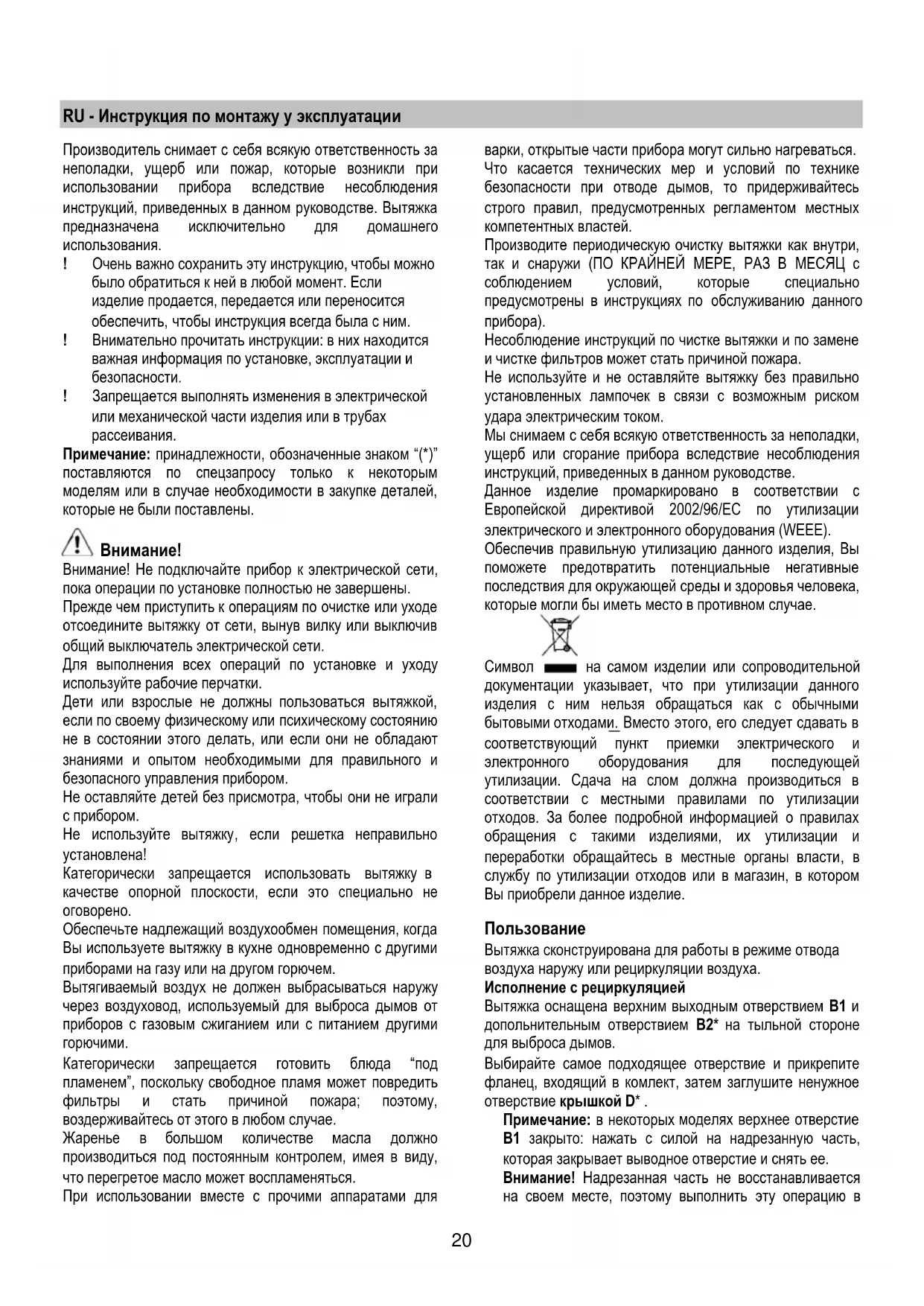 Несоблюдение инструкций по чистке вытяжки и по замене и чистке фильтров может стать причиной пожара. Не используйте и не оставляйте вытяжку без правильно установленных лампочек в связи с возможным риском удара электрическим током. Мы снимаем с себя всякую ответственность за неполадки, ущерб или сгорание прибора вследствие несоблюдения инструкций, приведенных в данном руководстве. Данное изделие промаркировано в соответствии с Европейской директивой 2002/96/EC по утилизации электрического и электронного оборудования (WEEE). Обеспечив правильную утилизацию данного изделия, Вы поможете предотвратить потенциальные негативные последствия для окружающей среды и здоровья человека, которые могли бы иметь место в противном случае.
