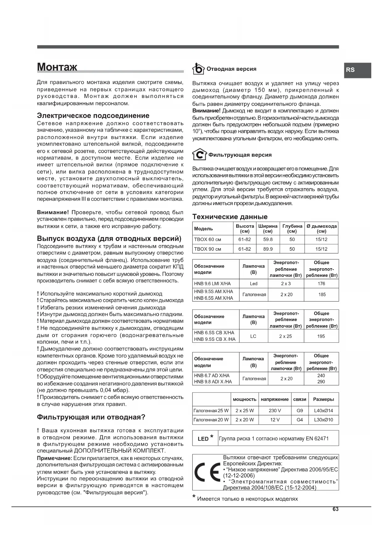 мощность напряжение связи Размеры 25 W 2 x 25 W 230 V G9 L40xØ14 20 W 2 x 20 W 12 V G4 L30xØ10 LED * Группа риска 1 согласно нормативу EN 62471 Вытяжки отвечают требованиям следующих Европейских Директив: