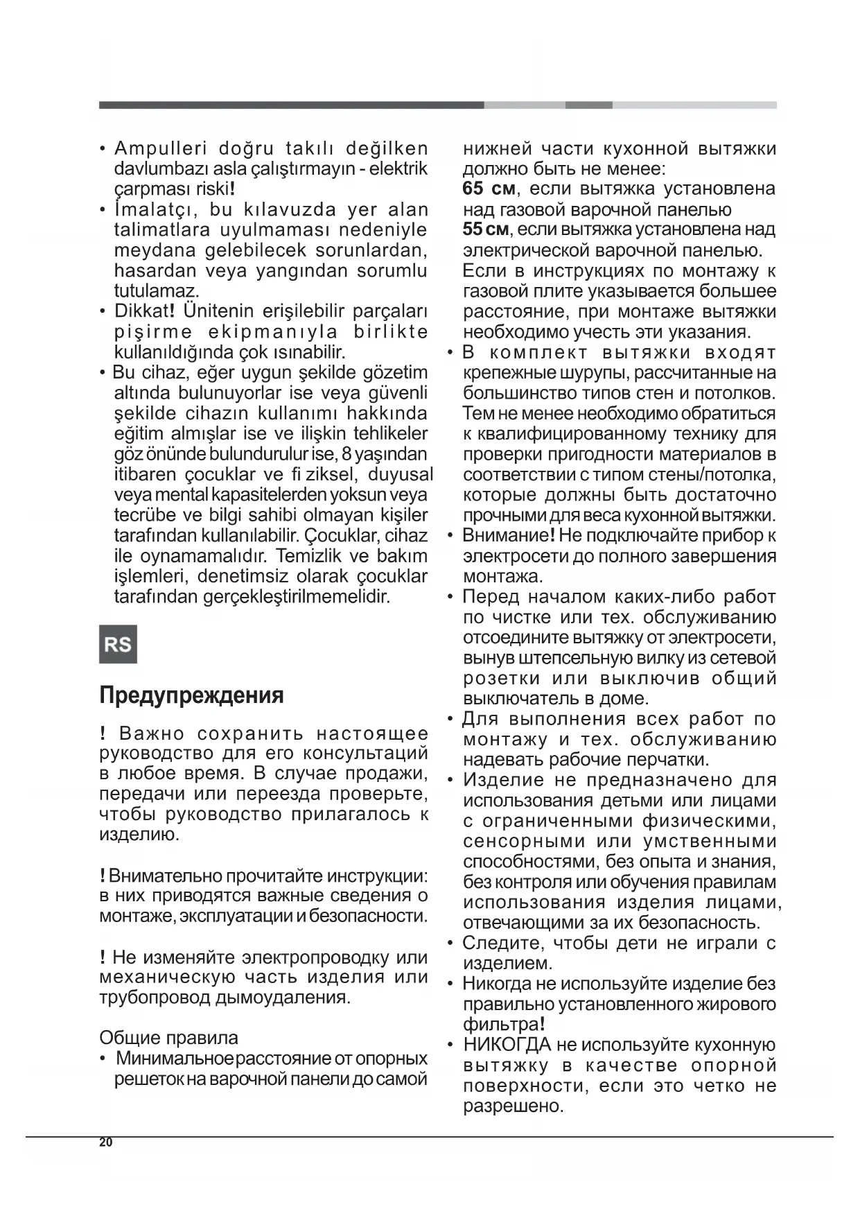 ! Внимательно прочитайте инструкции: в них приводятся важные сведения о монтаже, эксплуатации и безопасности. ! Не изменяйте электропроводку или механическую часть изделия или трубопровод дымоудаления. Общие правила
