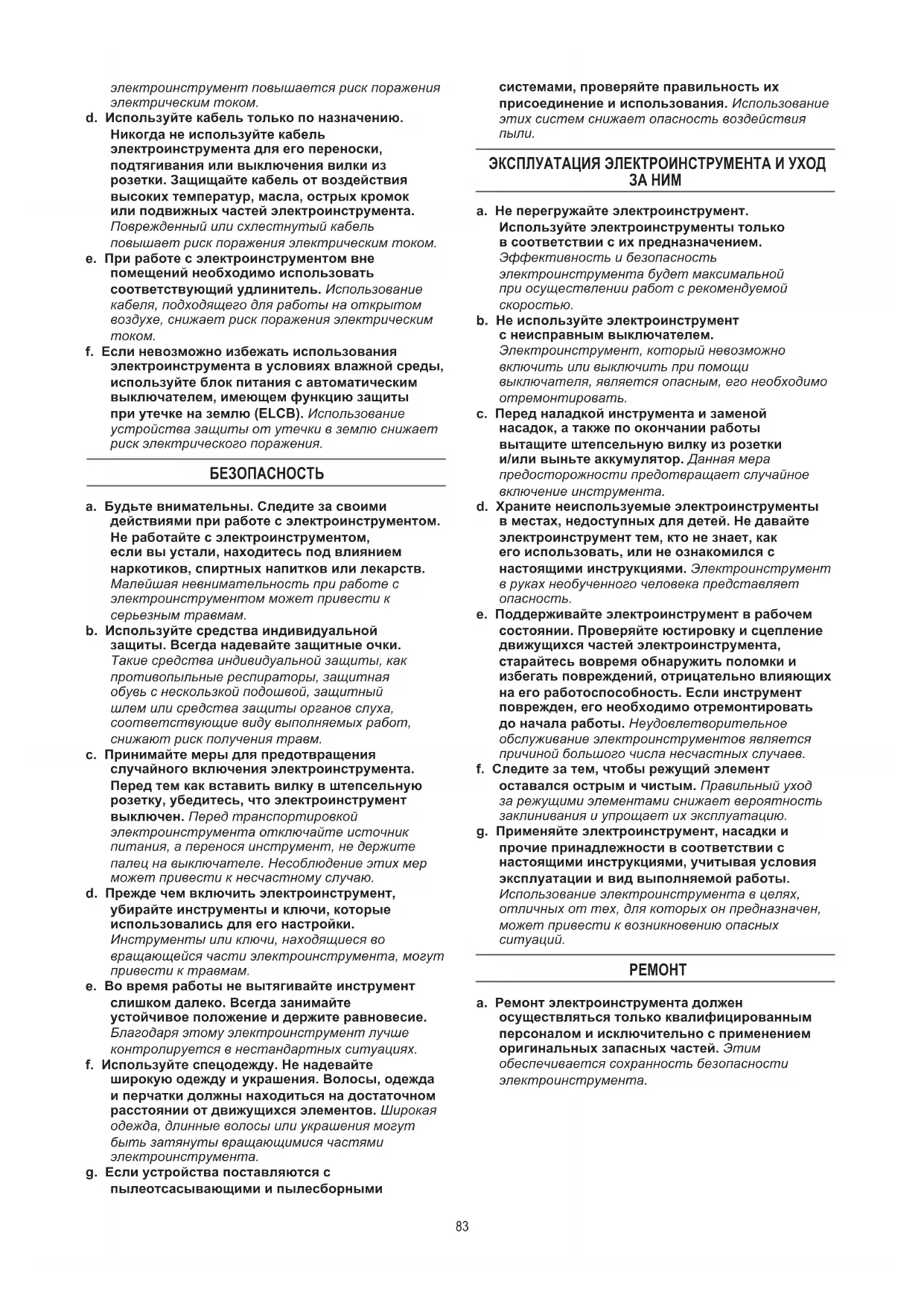 ЭЛЕКТРИЧЕСКИХ СИСТЕМ a. Штепсельная вилка электроинструмента должна подходить к штепсельной розетке. Запрещается модифицировать штепсельную вилку. Запрещается применять адаптеры для штепсельных вилок электроинструментов с защитным заземлением. Немодифицированные штепсельные вилки и соответствующие штепсельные розетки снижают риск поражения электротоком.b. Предотвращайте телесный контакт с заземленными поверхностями, например трубами, элементами отопления, кухонными плитами и холодильниками. При заземлении тела увеличивается риск поражения электрическим током.c. Защищайте электроинструмент от дождя и сырости. При попадании воды в RU