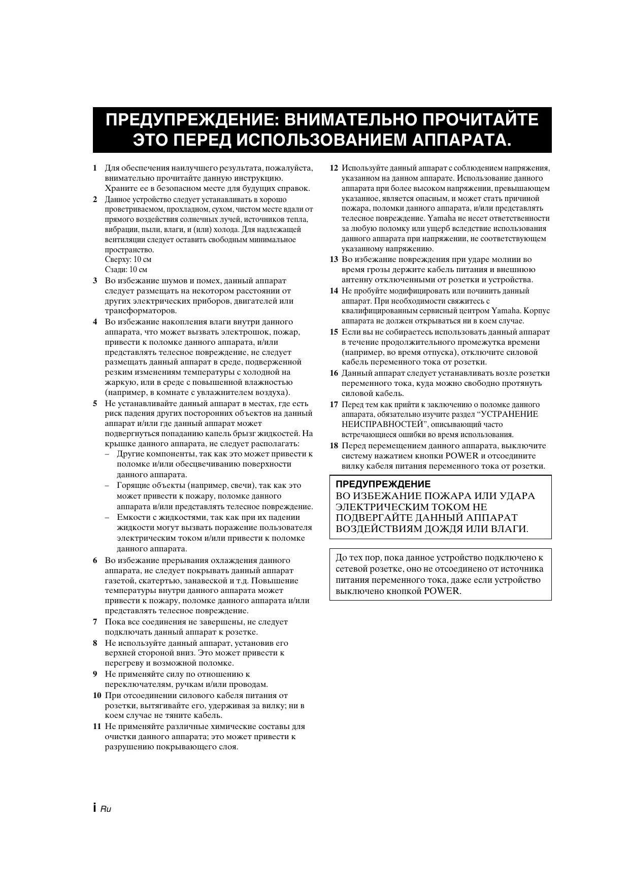 5 Evitez d’installer l’appareil dans un endroit où des objets peuvent tomber, ainsi que là où l’appareil pourrait être exposé à des éclaboussures ou des gouttes d’eau. Sur le dessus de l’appareil, ne placez pas : – d’autres appareils qui peuvent endommager la surface de l’appareil ou provoquer sa décoloration. – des objets se consumant (par exemple, une bougie) qui peuvent être responsables d’incendie, de dommage à l’appareil ou de blessure corporelle. – des récipients contenant des liquides qui peuvent être à l’origine de décharge électrique ou de dommage à l’appareil. 6 Ne couvrez pas l’appareil d’un journal, d’une nappe, d’un rideau, etc. car cela empêcherait l’évacuation de la chaleur. Toute augmentation de la température intérieure de l’appareil peut être responsable d’incendie, de dommage à l’appareil ou de blessure corporelle. 7 Ne branchez pas la fiche du cordon d’alimentation de l’appareil sur une prise secteur aussi longtemps que tous les raccordements n’ont pas été effectués. 8 Ne pas faire fonctionner l’appareil à l’envers. Il risquerait de chauffer et d’être endommagé. 9 N’exercez aucune force excessive sur les commutateurs, les boutons et les cordons. 10 Pour débrancher la fiche du cordon d’alimentation au niveau de la prise secteur, saisissez la fiche et ne tirez pas sur le cordon. 11 Ne nettoyez pas l’appareil au moyen d’un solvant chimique, ce qui pourrait endommager la finition. 12 N’alimentez l’appareil qu’à partir de la tension prescrite. Alimenter l’appareil sous une tension plus élevée est dangereux et peut être responsable d’incendie, de dommage à l’appareil ou de blessure corporelle. Yamaha ne saurait être tenue responsable des dommages résultant de l’alimentation de l’appareil sous une tension autre que celle prescrite. 13 Pour empêcher tout dommage causé par les éclairs, déconnectez le cordon d’alimentation et toute antenne extérieure de la prise murale pendant un orage.