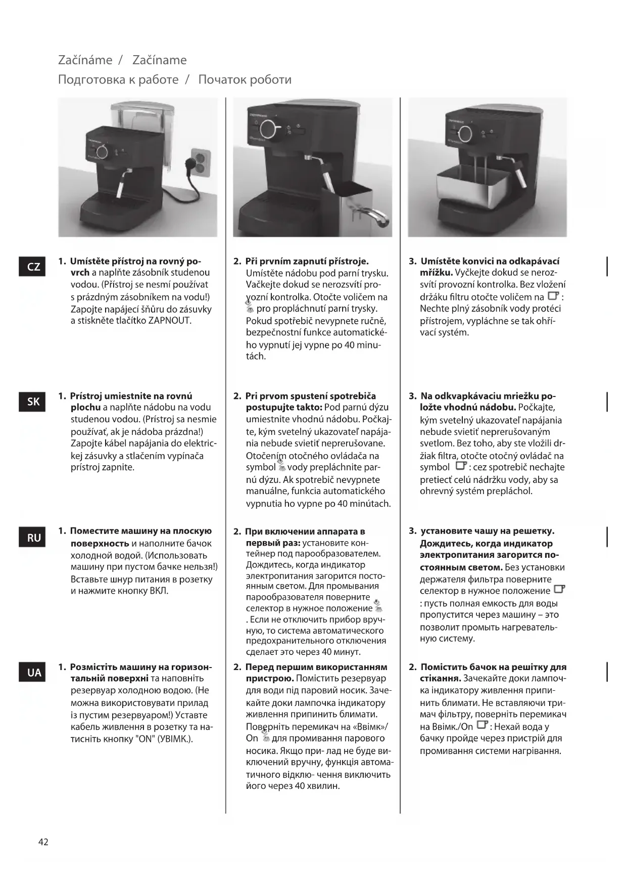 поверхность и наполните бачок холодной водой. (Использовать машину при пустом бачке нельзя!) Вставьте шнур питания в розетку и нажмите кнопку ВКЛ.