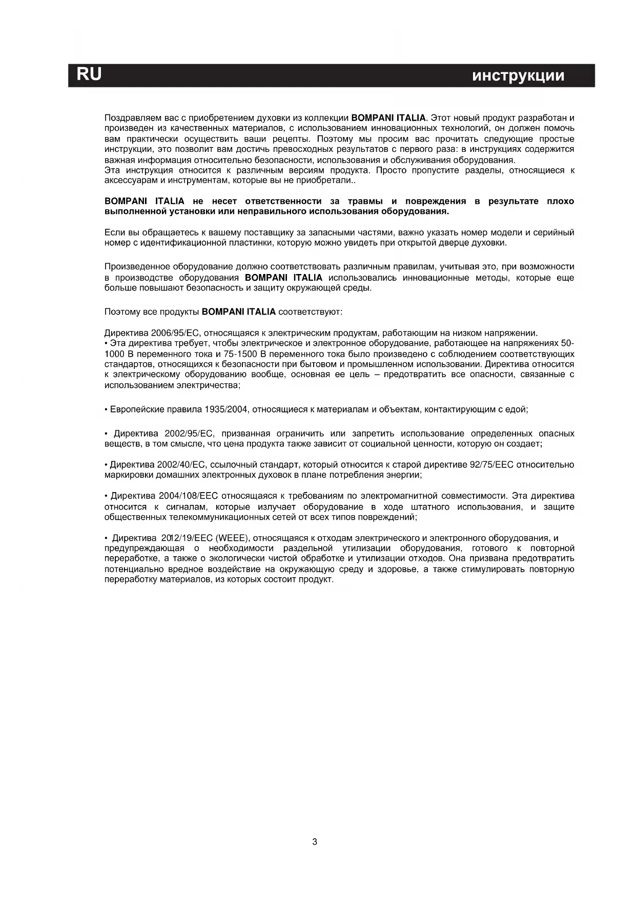 СОДЕРЖАНИЕПоздравляем вас с приобретением духовки из коллекции BOMPANI ITALIA. Этот новый продукт разработан и произведен из качественных материалов, с использованием инновационных технологий, он должен помочь вам практически осуществить ваши рецепты. Поэтому мы просим вас прочитать следующие простые инструкции, это позволит вам достичь превосходных результатов с первого раза: в инструкциях содержится важная информация относительно безопасности, использования и обслуживания оборудования. Эта инструкция относится к различным версиям продукта. Просто пропустите разделы, относящиеся к аксессуарам и инструментам, которые вы не приобретали.. BOMPANI ITALIA не несет ответственности за травмы и повреждения в результате плохо выполненной установки или неправильного использования оборудования. Если вы обращаетесь к вашему поставщику за запасными частями, важно указать номер модели и серийный номер с идентификационной пластинки, которую можно увидеть при открытой дверце духовки. Произведенное оборудование должно соответствовать различным правилам, учитывая это, при возможности в производстве оборудования BOMPANI ITALIA использовались инновационные методы, которые еще больше повышают безопасность и защиту окружающей среды. Поэтому все продукты BOMPANI ITALIA соответствуют: Директива 2006/95/EC, относящаяся к электрическим продуктам, работающим на низком напряжении.