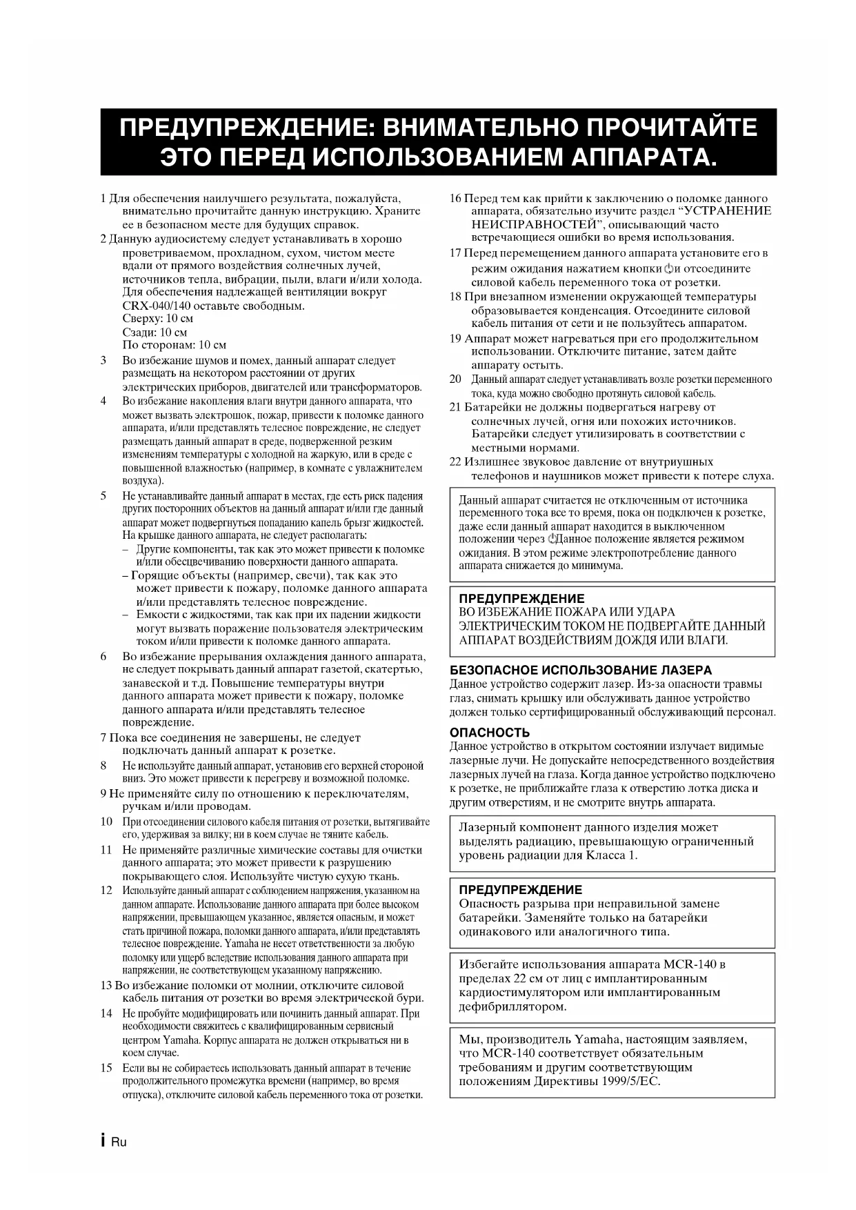 центром Yamaha. Корпус аппарата не должен открываться ни в