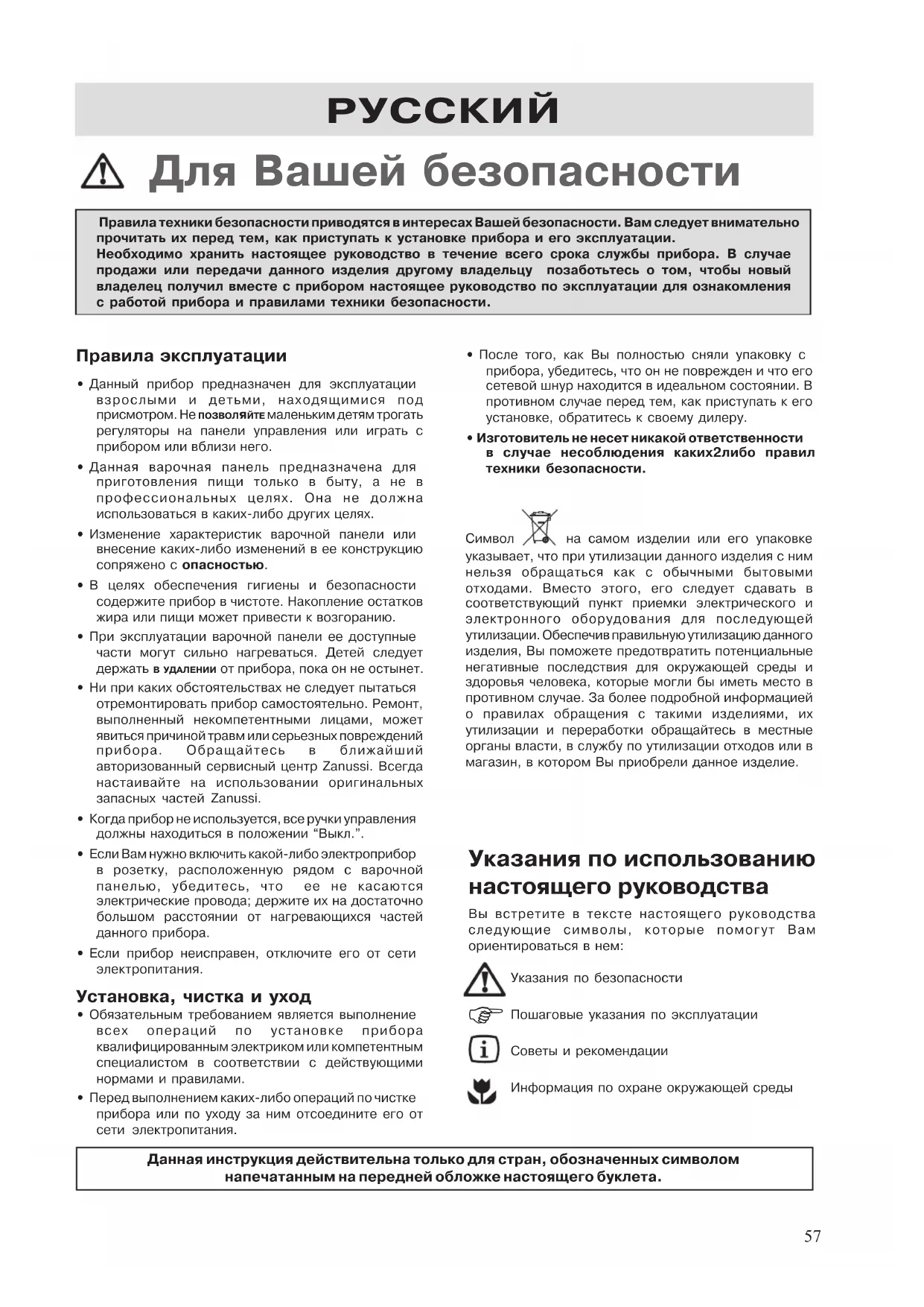 Правила эксплуатации • Данный прибор предназначен для эксплуатациивзрослыми и детьми, находящимися под присмотром. Не ПОЗВОЛяЙТЕ маленьким детям трогать регуляторы на панели управления или играть сприбором или вблизи него.• Данная варочная панель предназначена дляприготовления пищи только в быту, а не впрофессиональных целях. Она не должнаиспользоваться в какихлибо других целях.• Изменение характеристик варочной панели иливнесение какихлибо изменений в ее конструкциюсопряжено с опасностью.• В целях обеспечения гигиены и безопасностисодержите прибор в чистоте. Накопление остатковжира или пищи может привести к возгоранию.• При эксплуатации варочной панели ее доступныечасти могут сильно нагреваться. Детей следуетдержать В УДАЛЕНИИ от прибора, пока он не остынет. • Ни при каких обстоятельствах не следует пытатьсяотремонтировать прибор самостоятельно. Ремонт,выполненный некомпетентными лицами, можетявиться причиной травм или серьезных поврежденийприбора. Обращайтесь в ближайшийавторизованный сервисный центр Zanussi. Всегданастаивайте на использовании оригинальныхзапасных частей Zanussi.• Когда прибор не используется, все ручки управлениядолжны находиться в положении “Выкл.”.• Если Вам нужно включить какойлибо электроприборв розетку, расположенную рядом с варочнойпанелью, убедитесь, что ее не касаютсяэлектрические провода; держите их на достаточнобольшом расстоянии от нагревающихся частейданного прибора.• Если прибор неисправен, отключите его от сетиэлектропитания. Установка, чистка и уход • Обязательным требованием является выполнениевсех операций по установке прибораквалифицированным электриком или компетентнымспециалистом в соответствии с действующиминормами и правилами.• Перед выполнением какихлибо операций по чисткеприбора или по уходу за ним отсоедините его отсети электропитания. РУССКИЙ