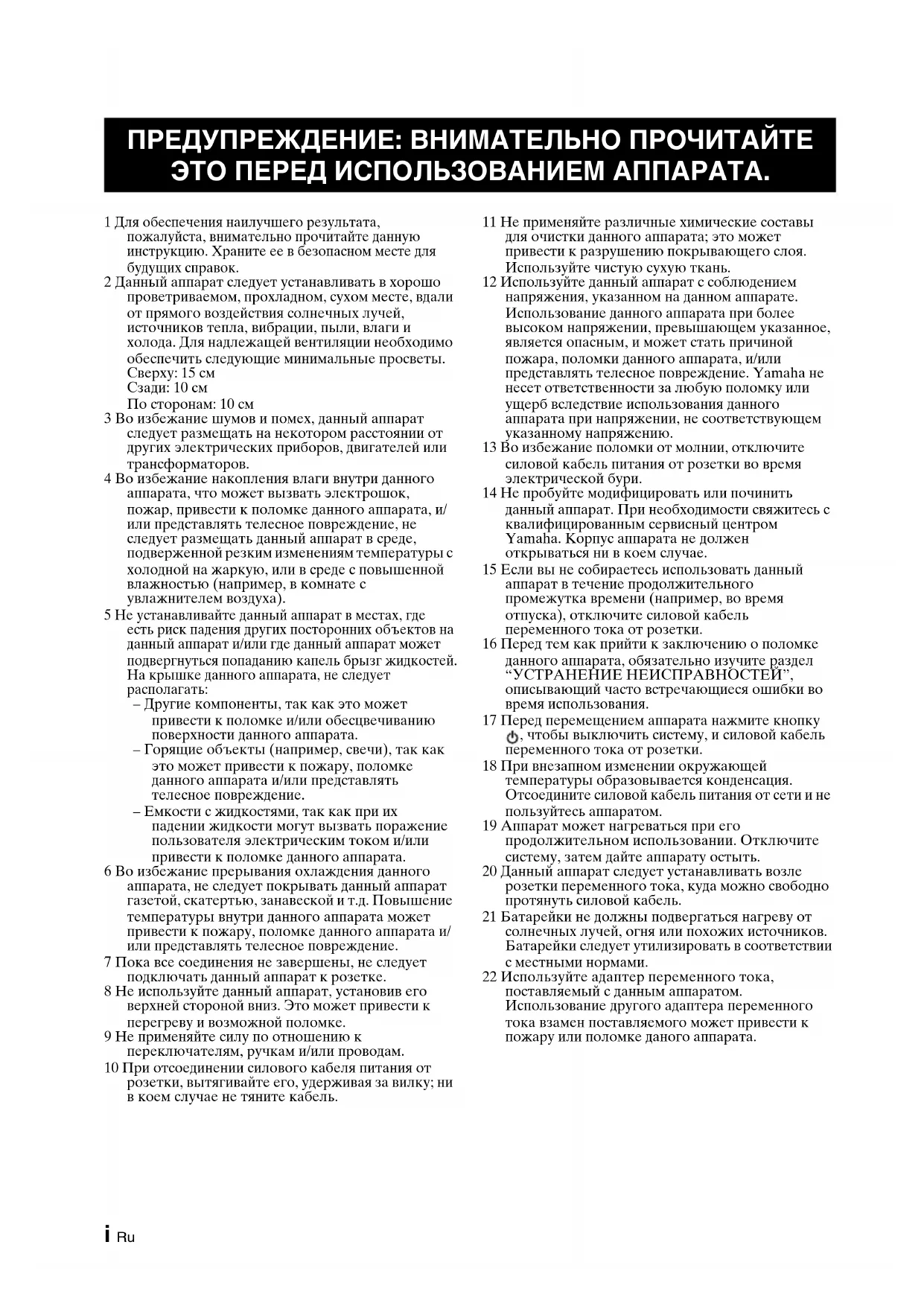 ADDITIONAL INFORMATION В случае возникновения проблем при использовании аппарата, сначала обратитесь к следующему списку. Если устранить проблему с помощью предложенных способов не удается, или если проблема не указана в списке, выключите аппарат и отсоедините от сети электропитания, затем обратитесь к ближайшему авторизованному дилеру Yamaha или сервисный центр. УСТРАНЕНИЕ НЕИСПРАВНОСТЕЙ
