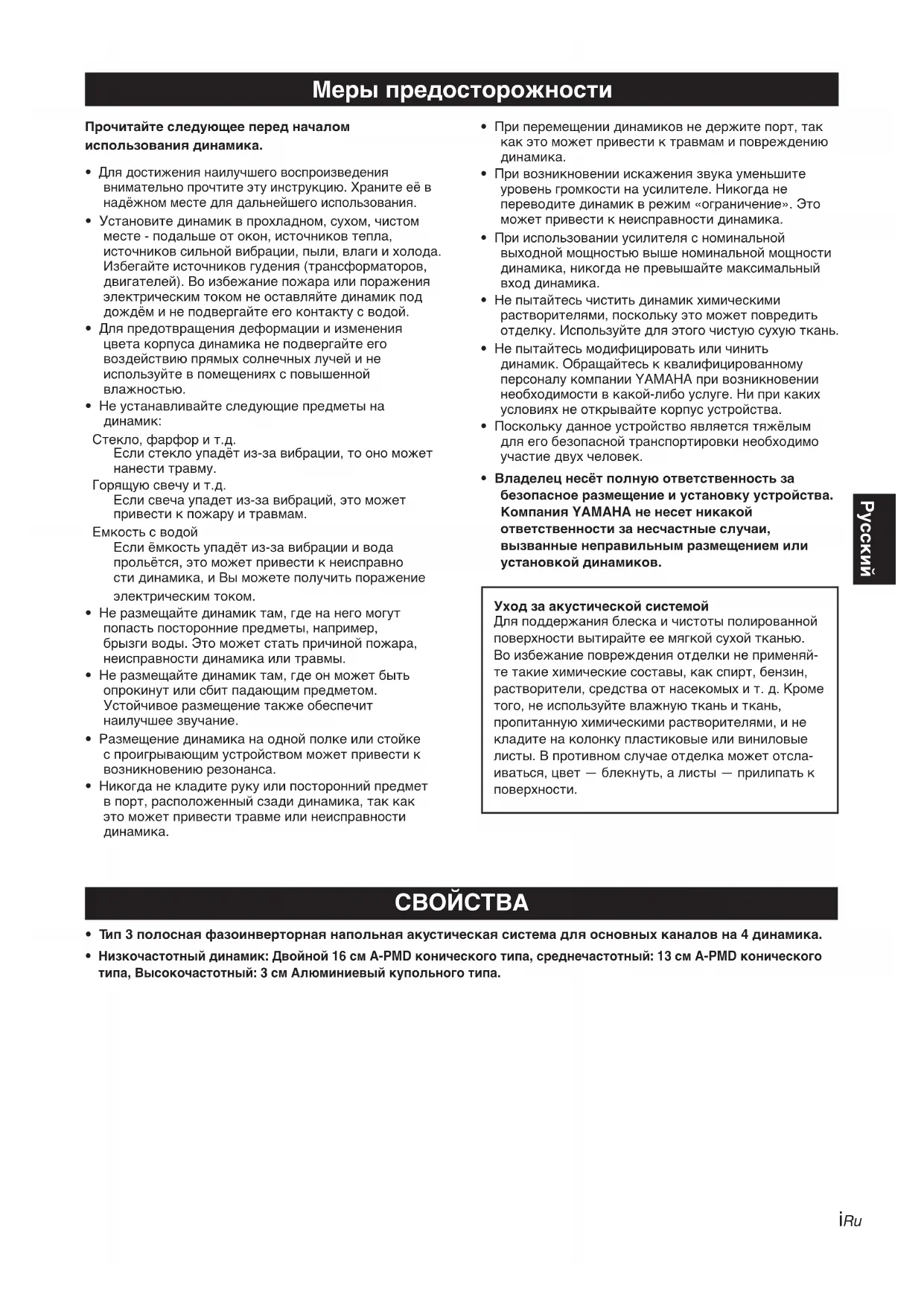 - Низкочастотный динамик: Двойной 16 см A-PMD конического типа, среднечастотный: 13 см A-PMD конического типа, Высокочастотный: 3 см Алюминиевый купольного типа. Уход за акустической системой Для поддержания блеска и чистоты полированной поверхности вытирайте ее мягкой сухой тканью. Во избежание повреждения отделки не применяй- те такие химические составы, как спирт, бензин, растворители, средства от насекомых и т. д. Кроме того, не используйте влажную ткань и ткань, пропитанную химическими растворителями, и не кладите на колонку пластиковые или виниловые листы. В противном случае отделка может отсла- иваться, цвет — блекнуть, а листы — прилипать к поверхности.1Ru Динамик сделан таким образом, что основной вес на- ходится в его верхней части, поэтому при ненадлежа- щем уходе он может упасть. В случае падения динамик может придти в неисправность или даже причинить травму (или стать причиной смерти) челове- ку и/или нанести вред имуществу владельца. МЕРЫ ПРЕДОСТОРОЖНОСТИ ПРИ РАЗМЕЩЕНИИ Для безопасного и правильного использования