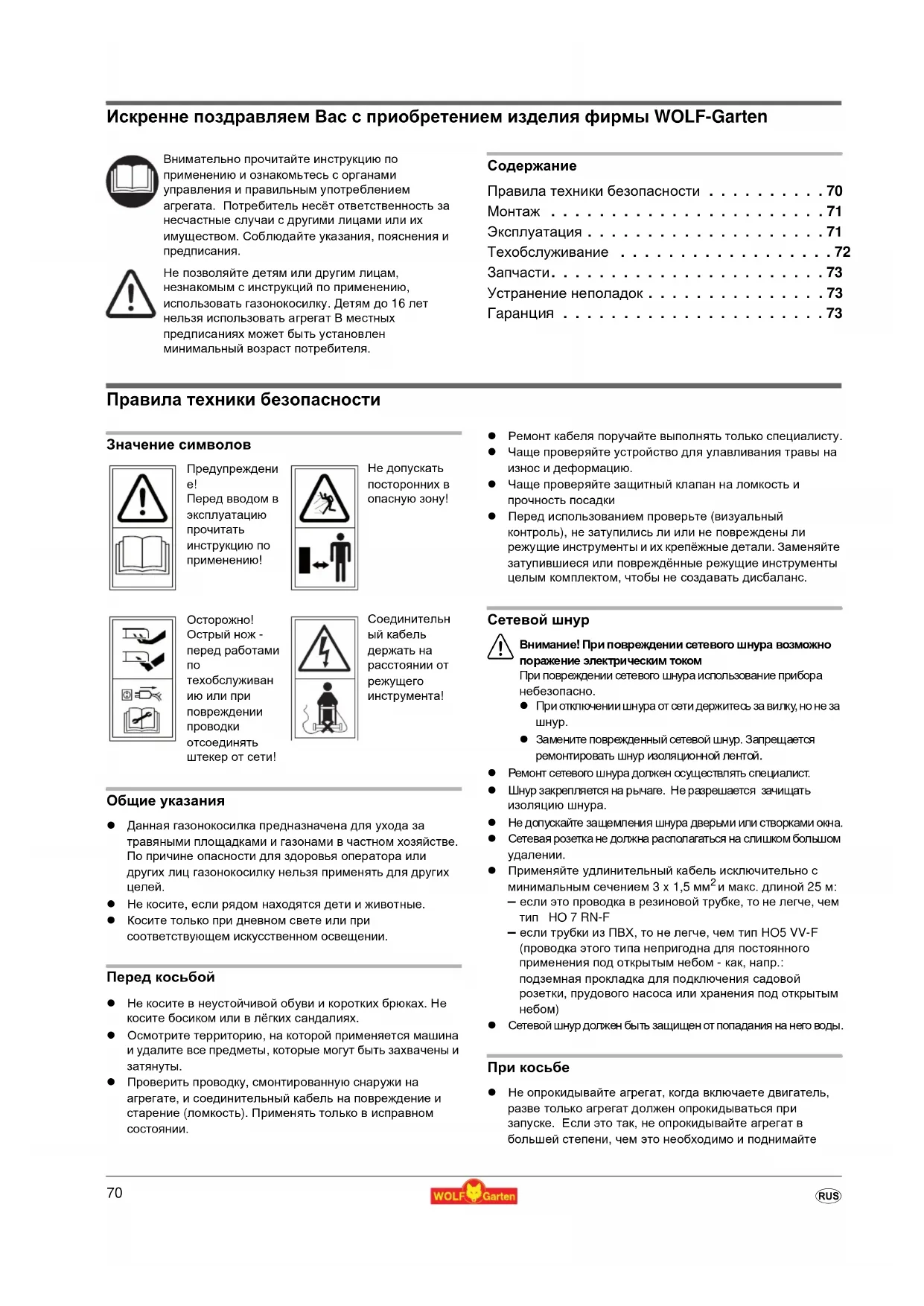 Отключите штепсель от сети. Не касайтесь вращающихся лопастей. Регулярно проверять на прочность посадки и подтягивать все видимые крепёжные винты и гайки, особенно на ножевом брусе. Внимание! Замену или заточку ножа всегда поручать производить в специальной мастерской, поскольку после раскручивания деталей в соответствии с правилами техники безопасности необходимо выполнять контроль дисбаланса. Применять только оригинальные запчасти WOLF-Garten, в противном случае нет гарантии, что Ваша косилка будет соответствовать правилам техники безопасности. Не оставляйте косилку в сырых помещениях. Уничтожение отходов