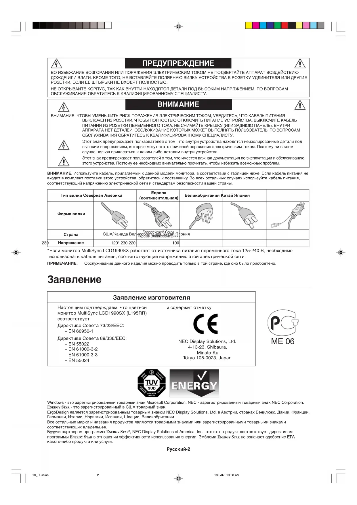 Заявление изготовителя Настоящим подтверждаем, что цветной монитор MultiSync LCD1990SX (L195RR) соответствует Директиве Совета 73/23/EEC: – EN 60950-1 Директиве Совета 89/336/EEC: – EN 55022 – EN 61000-3-2 – EN 61000-3-3 – EN 55024 и содержит отметку NEC Display Solutions, Ltd. 4-13-23, Shibaura, Minato-Ku To kyo 108-0023, Japan MЕ 06 ВНИМАНИЕ. Используйте кабель, прилагаемый к данной модели монитора, в соответствии с таблицей ниже. Если кабель питания не входит в комплект поставки этого устройства, обратитесь к поставщику. Во всех остальных случаях используйте кабель питания, соответствующий напряжению электрической сети и стандартам безопасности вашей страны.Тип вилки Северная АмерикаЕвропа(континентальная)Великобритания Китай ЯпонияФорма вилкиСтранаНапряжениеСША/Канада Великобритания Китай ЯпонияЕвропейский Союз(кроме Великобритании)120* 230 220 100230 *Если монитор MultiSync LCD1990SX работает от источника питания переменного тока 125-240 В, необходимо использовать кабель питания, соответствующий напряжению этой электрической сети. ПРИМЕЧАНИЕ. Обслуживание данного изделия можно проводить только в той стране, где оно было приобретено. 10_Russian 18/6/07, 10:58 AM2Русский Русский-3