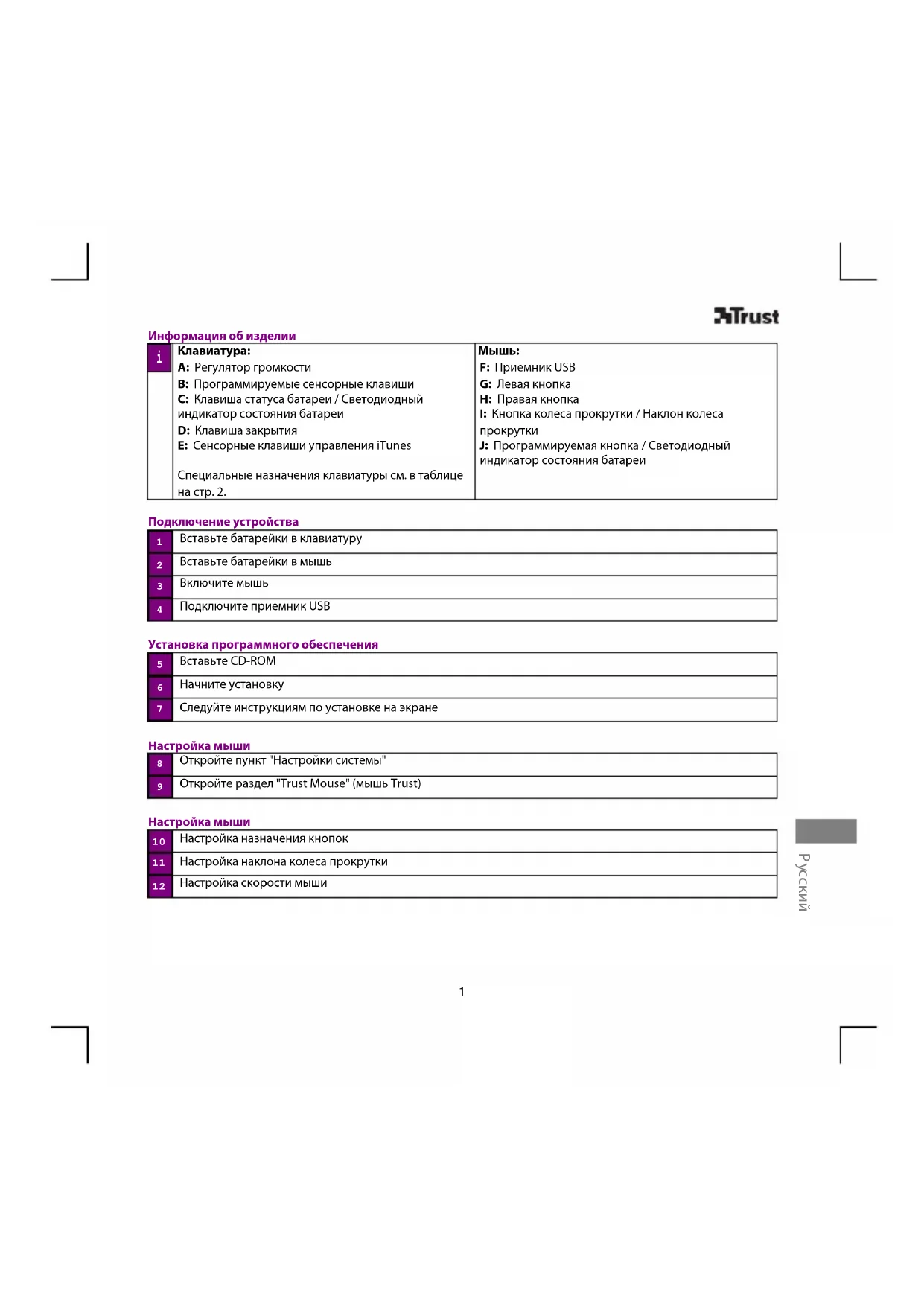 J: Программируемая кнопка / Светодиодный индикатор состояния батареи Подключение устройства Вставьте батарейки в клавиатуру Вставьте батарейки в мышь Включите мышь Подключите приемник USB Установка программного обеспечения Вставьте CD-ROM Начните установку Следуйте инструкциям по установке на экране Настройка мыши Откройте пункт "Настройки системы" Откройте раздел "Trust Mouse" (мышь Trust) Настройка мыши Настройка назначения кнопок Настройка наклона колеса прокрутки Настройка скорости мыши