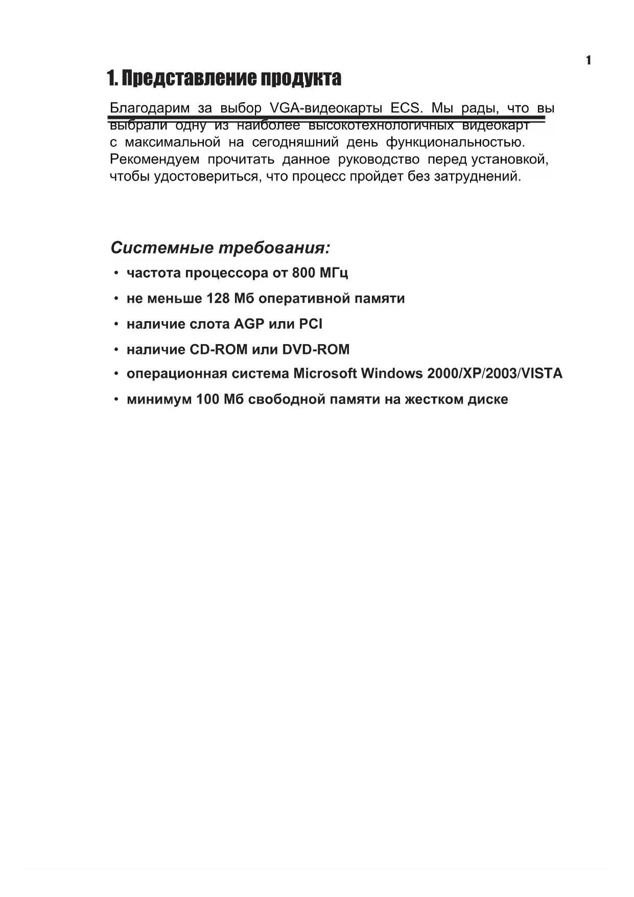 Благодарим за выбор VGA-видеокарты ECS. Мы рады, что вы выбрали одну из наиболее высокотехнологичных видеокарт с максимальной на сегодняшний день функциональностью. Рекомендуем прочитать данное руководство перед установкой, чтобы удостовериться, что процесс пройдет без затруднений.2