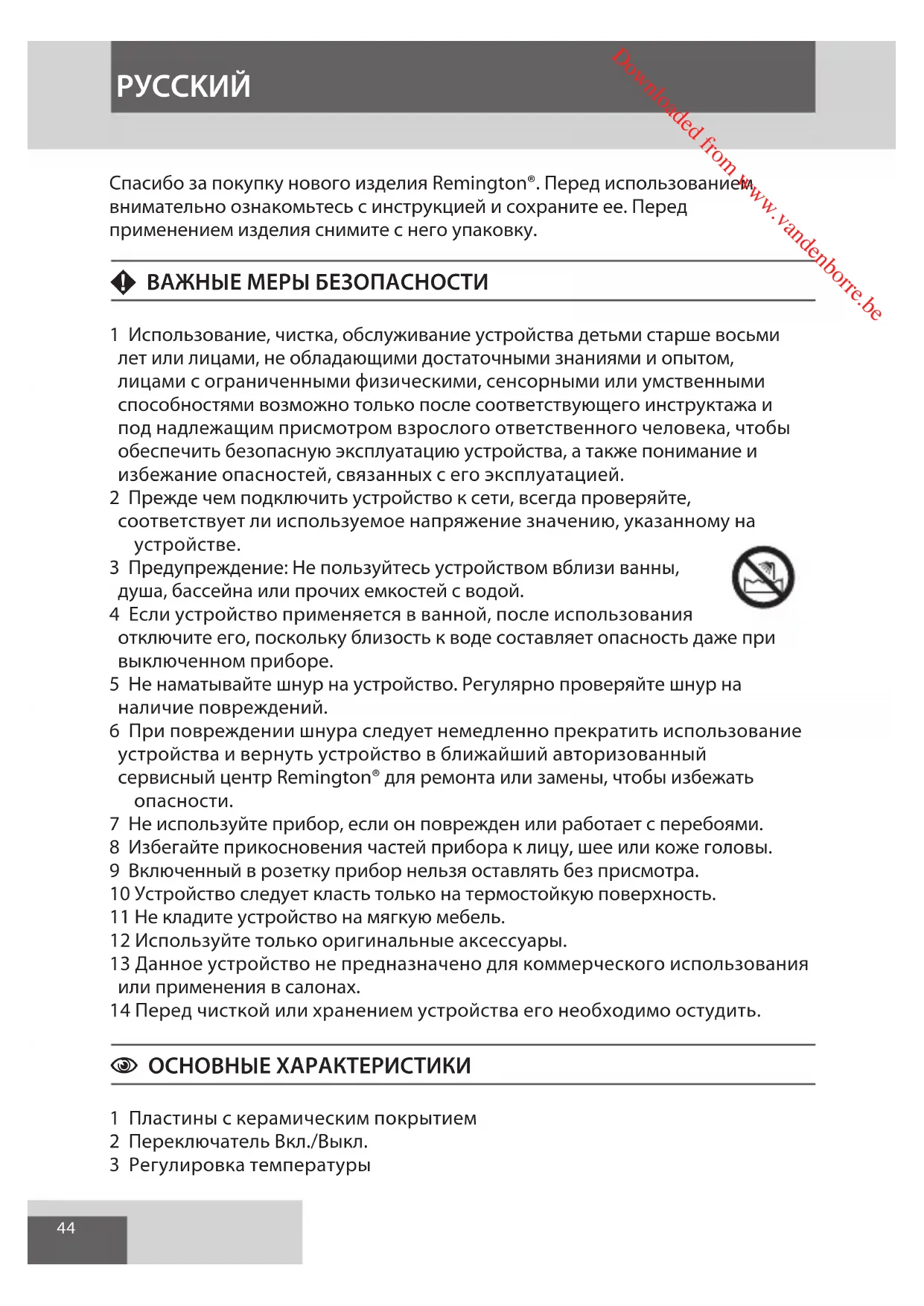 Скачайте инструкцию для вашего Выпрямитель для волос в формате PDF бесплатно! Найдите своё руководство S1005 - REMINGTON и возьмите своё электронное устройство обратно в руки. На этой странице опубликованы все документы, необходимые для использования вашего устройства. S1005 бренда REMINGTON.
