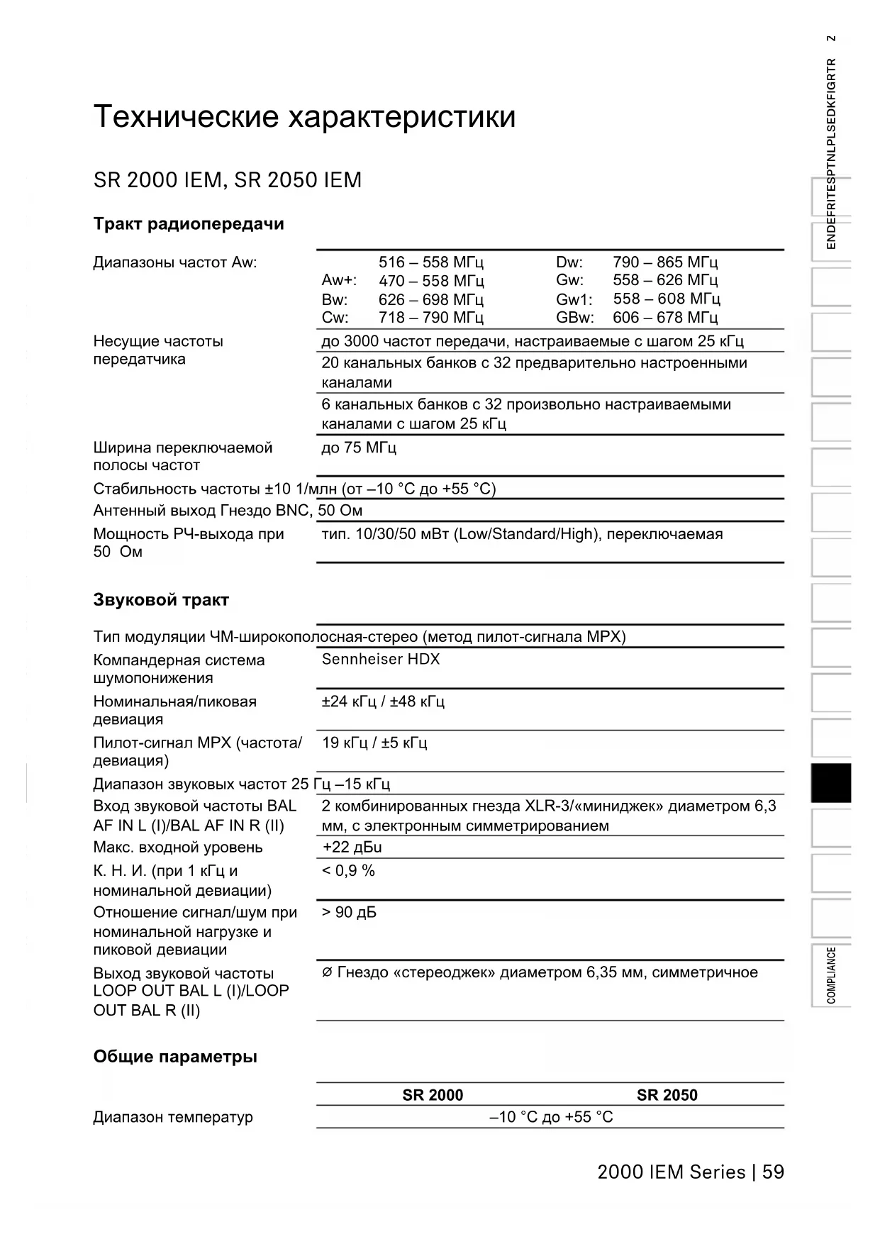 COMPLIANCE Параметры низкочастотного тракта Компандерная система шумоподавления Sennheiser HDX Отношение сигнал/шум (1 мВ, пиковая девиация) 90 дБ КНИ ≤ 0,9 % Выходная мощность при 2,4 В, 5 % THD, номинальная