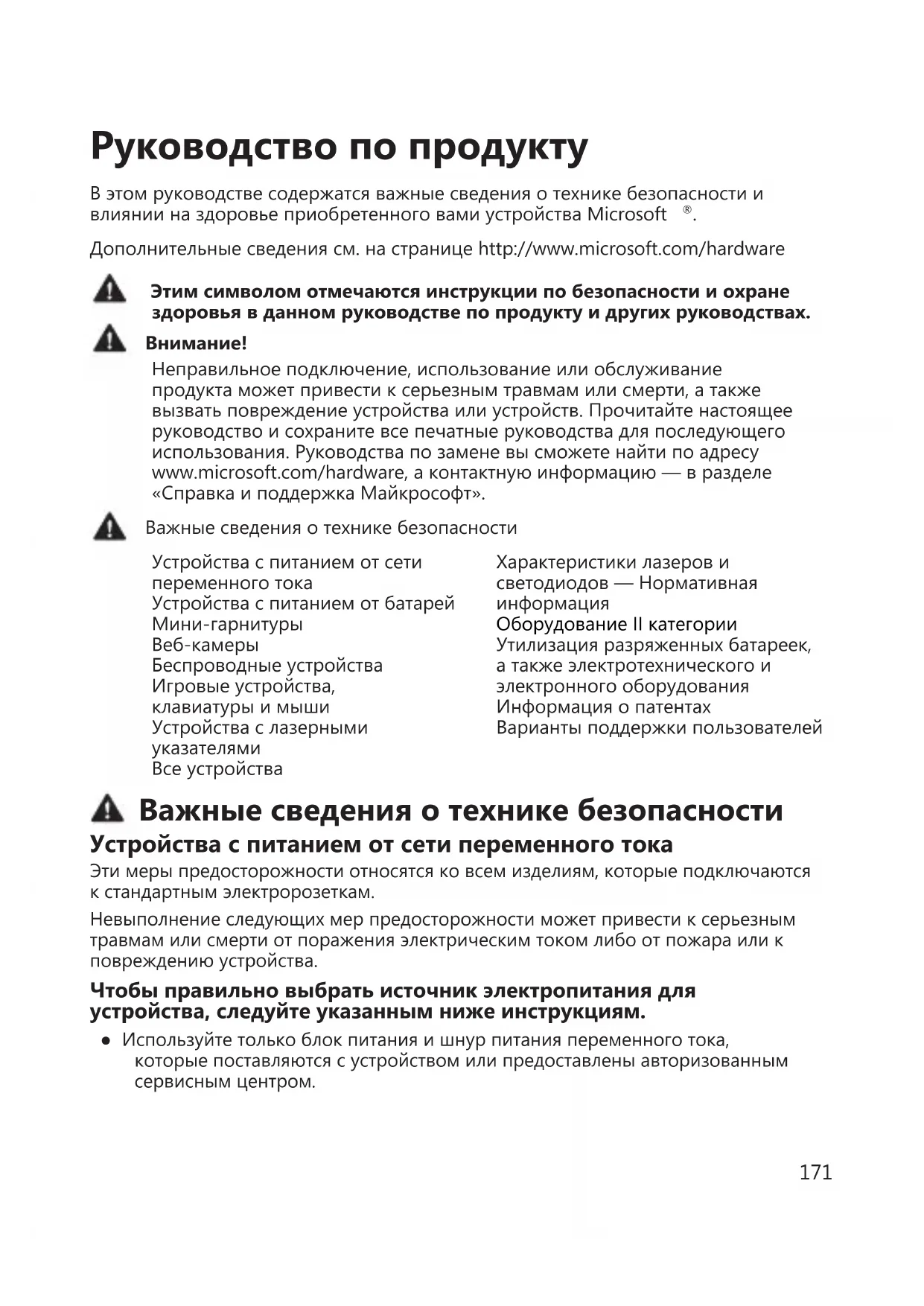 . Дополнительные сведения см. на странице http://www.microsoft.com/hardware Этим символом отмечаются инструкции по безопасности и охране здоровья в данном руководстве по продукту и других руководствах. Внимание! Неправильное подключение, использование или обслуживание продукта может привести к серьезным травмам или смерти, а также вызвать повреждение устройства или устройств. Прочитайте настоящее руководство и сохраните все печатные руководства для последующего использования. Руководства по замене вы сможете найти по адресу www.microsoft.com/hardware, а контактную информацию — в разделе «Справка и поддержка Майкрософт». Важные сведения о технике безопасностиУстройства с питанием от сети переменного токаУстройства с питанием от батарейМини-гарнитурыВеб-камерыБеспроводные устройстваИгровые устройства,клавиатуры и мышиУстройства с лазерными указателямиВсе устройстваХарактеристики лазеров и светодиодов — Нормативная информация Оборудование II категорииУтилизация разряженных батареек, а также электротехнического и электронного оборудования Информация о патентах Варианты поддержки пользователей Важные сведения о технике безопасности Устройства с питанием от сети переменного тока Эти меры предосторожности относятся ко всем изделиям, которые подключаются к стандартным электророзеткам.Невыполнение следующих мер предосторожности может привести к серьезным травмам или смерти от поражения электрическим током либо от пожара или к повреждению устройства. Чтобы правильно выбрать источник электропитания для