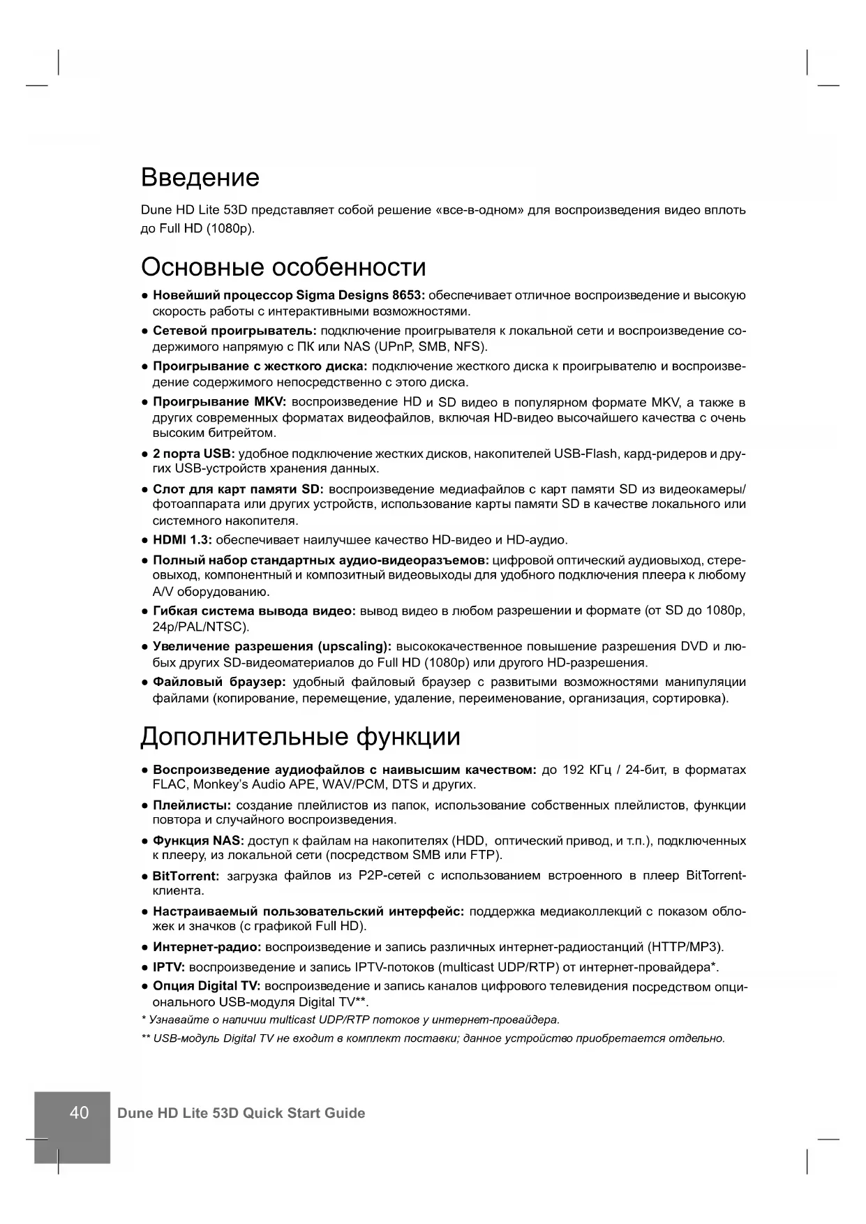 Dune HD Lite 53D представляет собой решение «все-в-одном» для воспроизведения видео вплоть до Full HD (1080p). Основные особенности ● Новейший процессор Sigma Designs 8653: обеспечивает отличное воспроизведение и высокую скорость работы с интерактивными возможностями. ● Сетевой проигрыватель: подключение проигрывателя к локальной сети и воспроизведение со- держимого напрямую с ПК или NAS (UPnP, SMB, NFS). ● Проигрывание с жесткого диска: подключение жесткого диска к проигрывателю и воспроизве- дение содержимого непосредственно с этого диска. ● Проигрывание MKV: воспроизведение HD и SD видео в популярном формате MKV, а также в других современных форматах видеофайлов, включая HD-видео высочайшего качества с очень высоким битрейтом. ● 2 порта USB: удобное подключение жестких дисков, накопителей USB-Flash, кард-ридеров и дру- гих USB-устройств хранения данных. ● Слот для карт памяти SD: воспроизведение медиафайлов с карт памяти SD из видеокамеры/ фотоаппарата или других устройств, использование карты памяти SD в качестве локального или системного накопителя. ● HDMI 1.3: обеспечивает наилучшее качество HD-видео и HD-аудио. ● Полный набор стандартных аудио-видеоразъемов: цифровой оптический аудиовыход, стере- овыход, компонентный и композитный видеовыходы для удобного подключения плеера к любому A/V оборудованию. ● Гибкая система вывода видео: вывод видео в любом разрешении и формате (от SD до 1080p, 24p/PAL/NTSC). ● Увеличение разрешения (upscaling): высококачественное повышение разрешения DVD и лю- бых других SD-видеоматериалов до Full HD (1080p) или другого HD-разрешения. ● Файловый браузер: удобный файловый браузер с развитыми возможностями манипуляции файлами (копирование, перемещение, удаление, переименование, организация, сортировка). Дополнительные функции ● Воспроизведение аудиофайлов с наивысшим качеством: до 192 КГц / 24-бит, в форматах FLAC, Monkey’s Audio APE, WAV/PCM, DTS и других. ● Плейлисты: создание плейлистов из папок, использование собственных плейлистов, функции повтора и случайного воспроизведения. ● Функция NAS: доступ к файлам на накопителях (HDD, оптический привод, и т.п.), подключенных к плееру, из локальной сети (посредством SMB или FTP). ● BitTorrent: загрузка файлов из P2P-сетей с использованием встроенного в плеер BitTorrent-