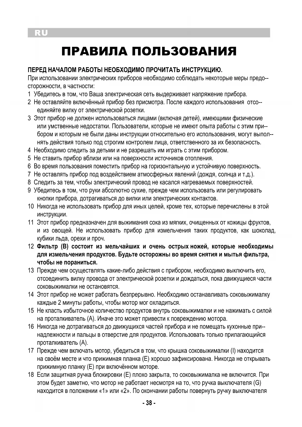 18 Если защитная ручка блокировки (E) плохо закрыта, то соковыжималка не включится. При