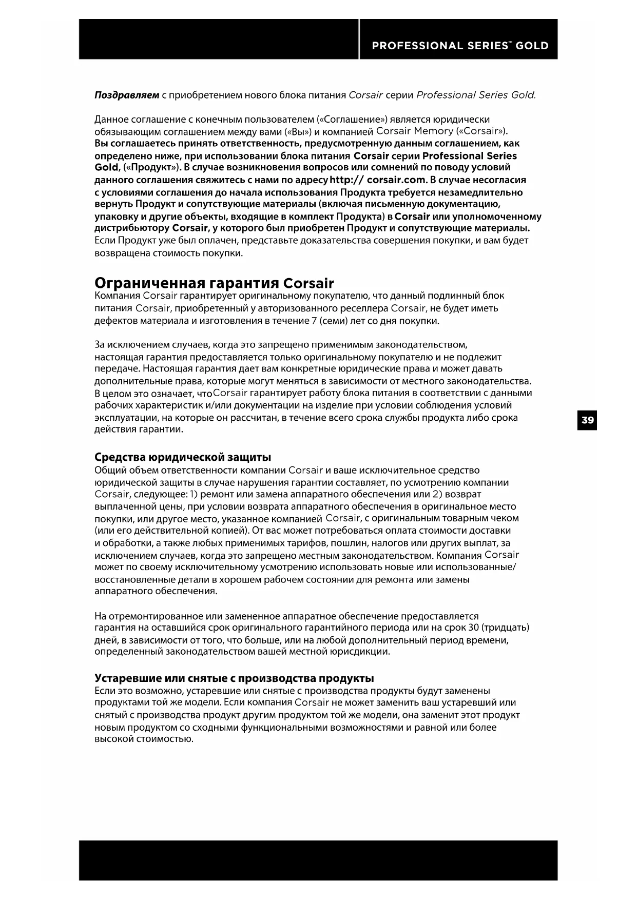 Corsair, приобретенный у авторизованного реселлера Corsair, не будет иметь дефектов материала и изготовления в течение 7 (семи) лет со дня покупки. За исключением случаев, когда это запрещено применимым законодательством, настоящая гарантия предоставляется только оригинальному покупателю и не подлежит передаче. Настоящая гарантия дает вам конкретные юридические права и может давать дополнительные права, которые могут меняться в зависимости от местного законодательства. В целом это означает, что Corsair гарантирует работу блока питания в соответствии с данными рабочих характеристик и/или документации на изделие при условии соблюдения условий эксплуатации, на которые он рассчитан, в течение всего срока службы продукта либо срока действия гарантии. Средства юридической защиты Общий объем ответственности компании Corsair и ваше исключительное средство юридической защиты в случае нарушения гарантии составляет, по усмотрению компании Corsair, следующее: 1) ремонт или замена аппаратного обеспечения или 2) возврат выплаченной цены, при условии возврата аппаратного обеспечения в оригинальное место покупки, или другое место, указанное компанией Corsair, с оригинальным товарным чеком (или его действительной копией). От вас может потребоваться оплата стоимости доставки и обработки, а также любых применимых тарифов, пошлин, налогов или других выплат, за исключением случаев, когда это запрещено местным законодательством. Компания Corsair может по своему исключительному усмотрению использовать новые или использованные/ восстановленные детали в хорошем рабочем состоянии для ремонта или замены аппаратного обеспечения. На отремонтированное или замененное аппаратное обеспечение предоставляется гарантия на оставшийся срок оригинального гарантийного периода или на срок 30 (тридцать) дней, в зависимости от того, что больше, или на любой дополнительный период времени, определенный законодательством вашей местной юрисдикции. Устаревшие или снятые с производства продукты Если это возможно, устаревшие или снятые с производства продукты будут заменены продуктами той же модели. Если компания Corsair не может заменить ваш устаревший или снятый с производства продукт другим продуктом той же модели, она заменит этот продукт новым продуктом со сходными функциональными возможностями и равной или более высокой стоимостью.40 PROFESSIONAL SERIES
