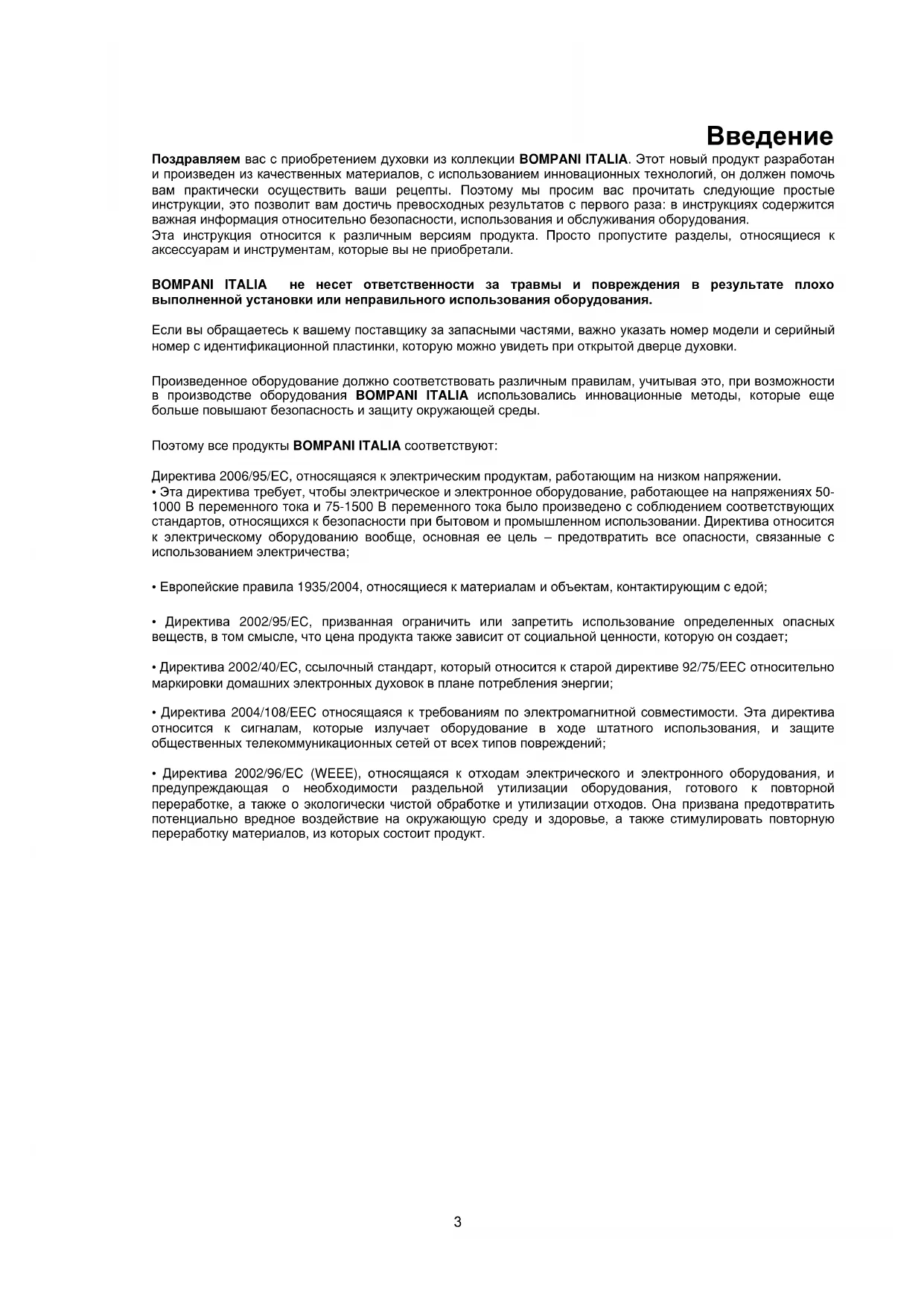 Изображения……………………………………………………………………………………………………...18 2Введение Поздравляем вас с приобретением духовки из коллекции BOMPANI ITALIA. Этот новый продукт разработан и произведен из качественных материалов, с использованием инновационных технологий, он должен помочь вам практически осуществить ваши рецепты. Поэтому мы просим вас прочитать следующие простые инструкции, это позволит вам достичь превосходных результатов с первого раза: в инструкциях содержится важная информация относительно безопасности, использования и обслуживания оборудования. Эта инструкция относится к различным версиям продукта. Просто пропустите разделы, относящиеся к аксессуарам и инструментам, которые вы не приобретали. BOMPANI ITALIA не несет ответственности за травмы и повреждения в результате плохо выполненной установки или неправильного использования оборудования. Если вы обращаетесь к вашему поставщику за запасными частями, важно указать номер модели и серийный номер с идентификационной пластинки, которую можно увидеть при открытой дверце духовки. Произведенное оборудование должно соответствовать различным правилам, учитывая это, при возможности в производстве оборудования BOMPANI ITALIA использовались инновационные методы, которые еще больше повышают безопасность и защиту окружающей среды. Поэтому все продукты BOMPANI ITALIA соответствуют: Директива 2006/95/EC, относящаяся к электрическим продуктам, работающим на низком напряжении.