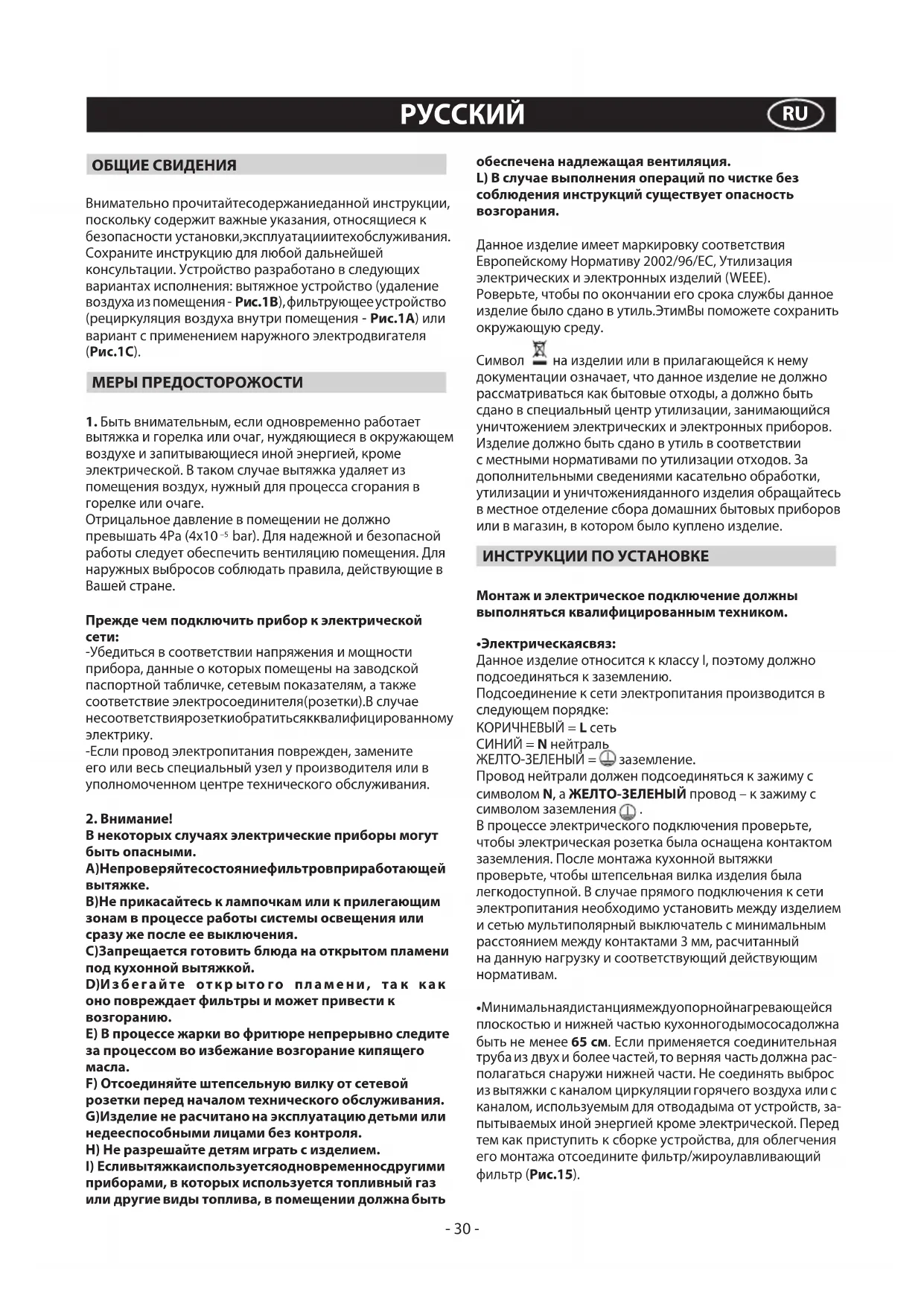 приборами, в которых используется топливный газ или другие виды топлива, в помещении должна быть обеспечена надлежащая вентиляция. L) В случае выполнения операций по чистке без соблюдения инструкций существует опасность возгорания. Данное изделие имеет маркировку соответствия Европейскому Нормативу 2002/96/ЕС, Утилизация электрических и электронных изделий (WEEE). Роверьте, чтобы по окончании его срока службы данное изделие было сдано в утиль.ЭтимВы поможете сохранить окружающую среду.