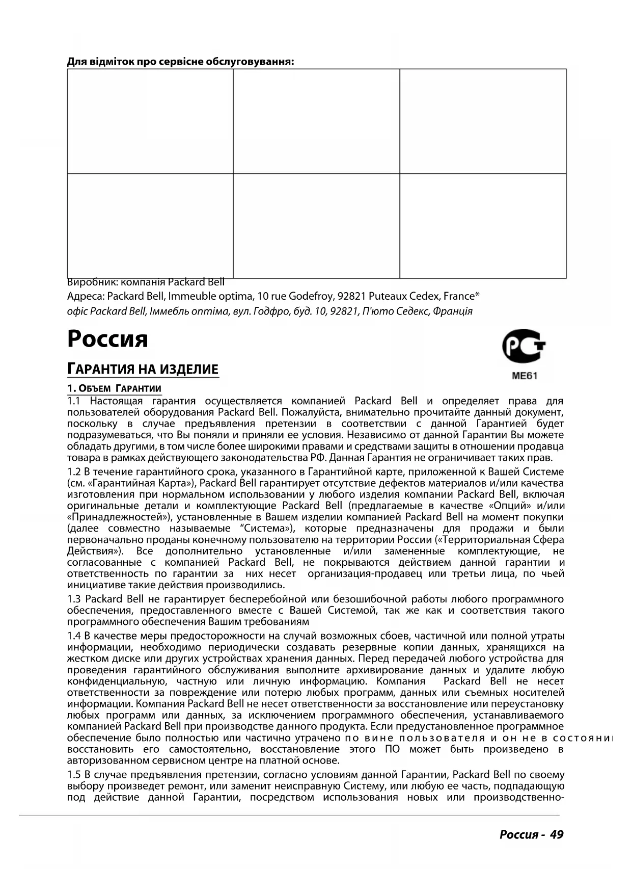 1.1 Настоящая гарантия осуществляется компанией Packard Bell и определяет права для