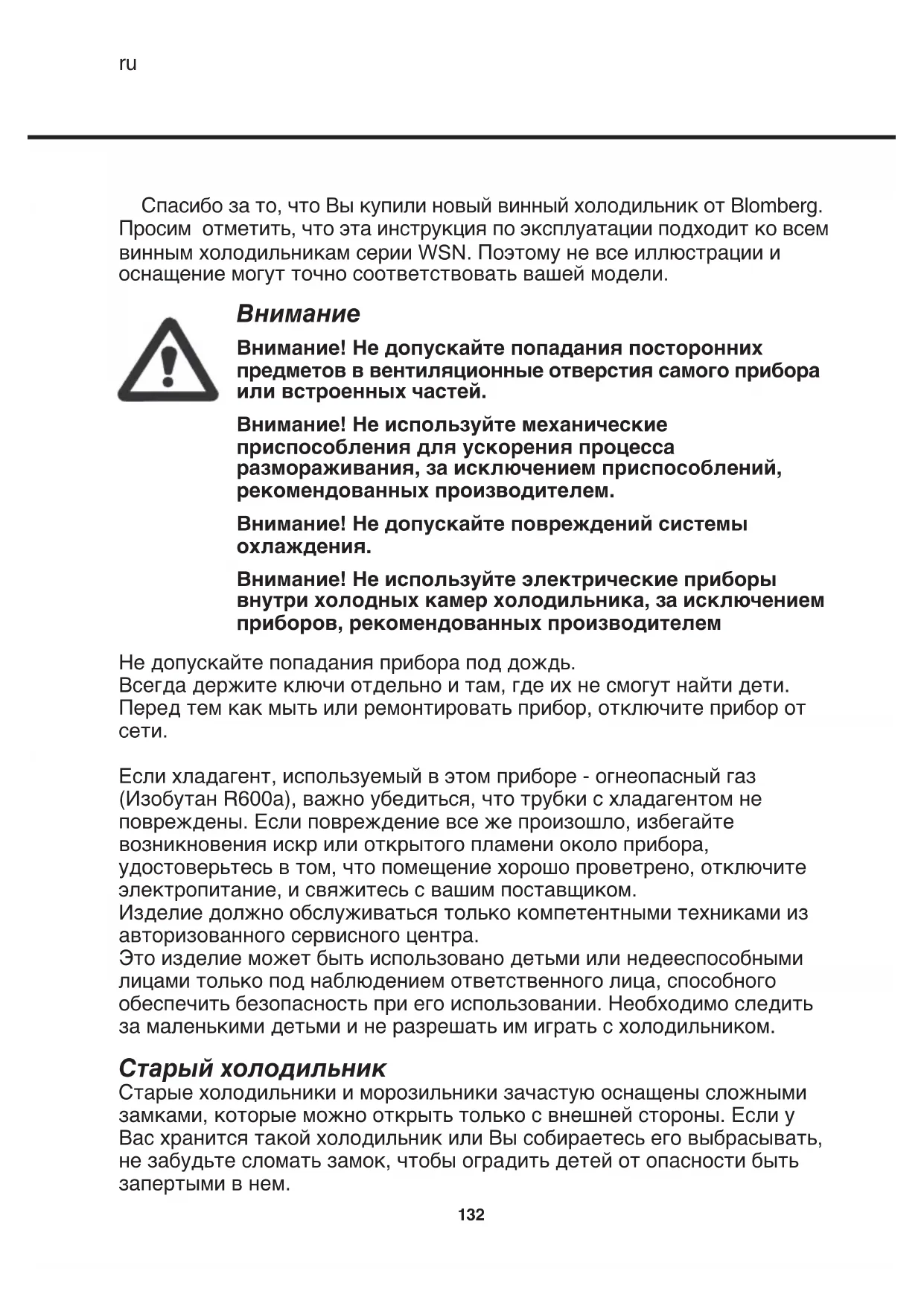 Внимание! Не допускайте попадания посторонних предметов в вентиляционные отверстия самого прибора или встроенных частей. Внимание! Не используйте механические приспособления для ускорения процесса размораживания, за исключением приспособлений, рекомендованных производителем. Внимание! Не допускайте повреждений системы охлаждения. Внимание! Не используйте электрические приборы внутри холодных камер холодильника, за исключением приборов, рекомендованных производителем Не допускайте попадания прибора под дождь. Всегда держите ключи отдельно и там, где их не смогут найти дети. Перед тем как мыть или ремонтировать прибор, отключите прибор от