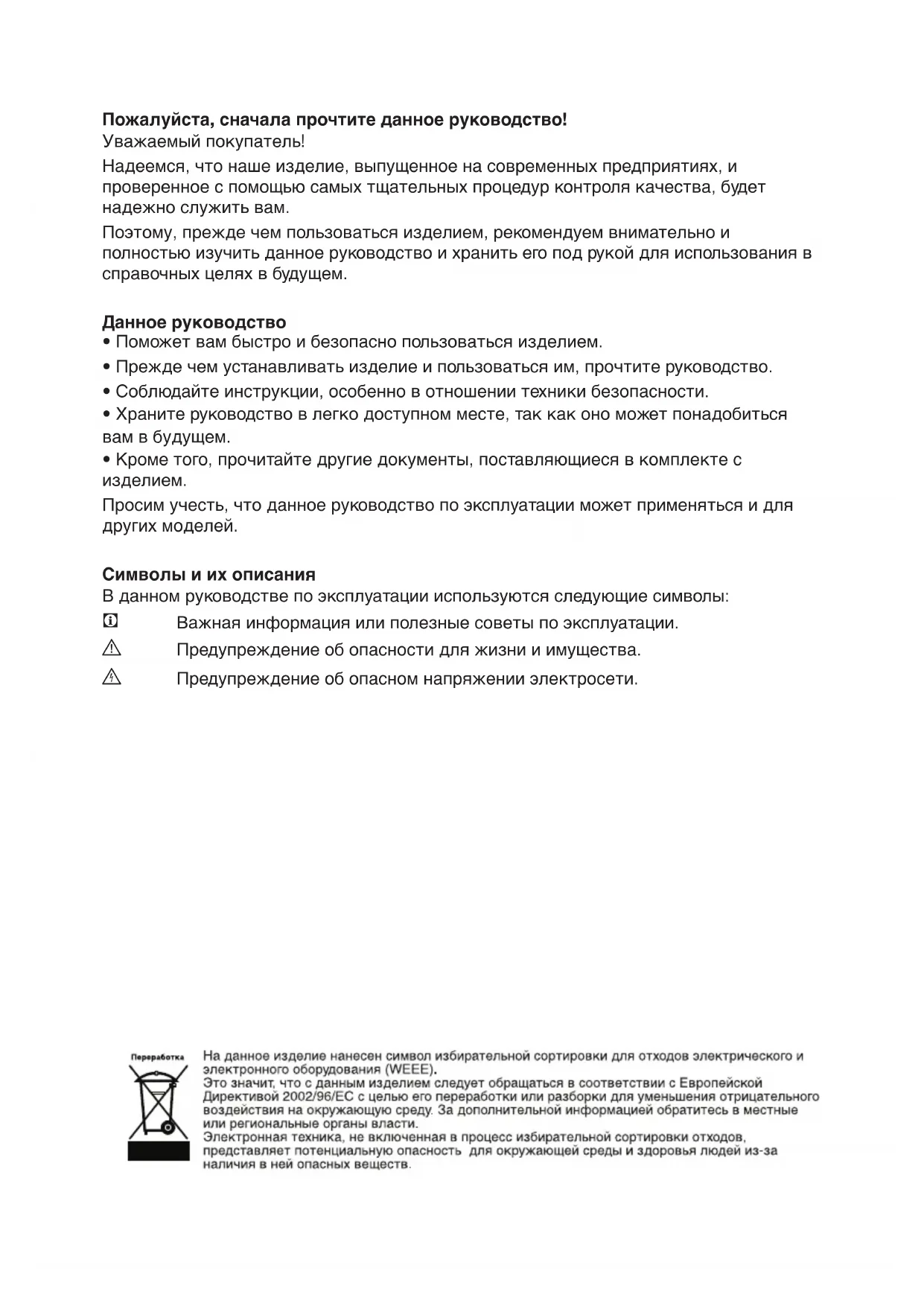 - Прежде чем устанавливать изделие и пользоваться им, прочтите руководство.