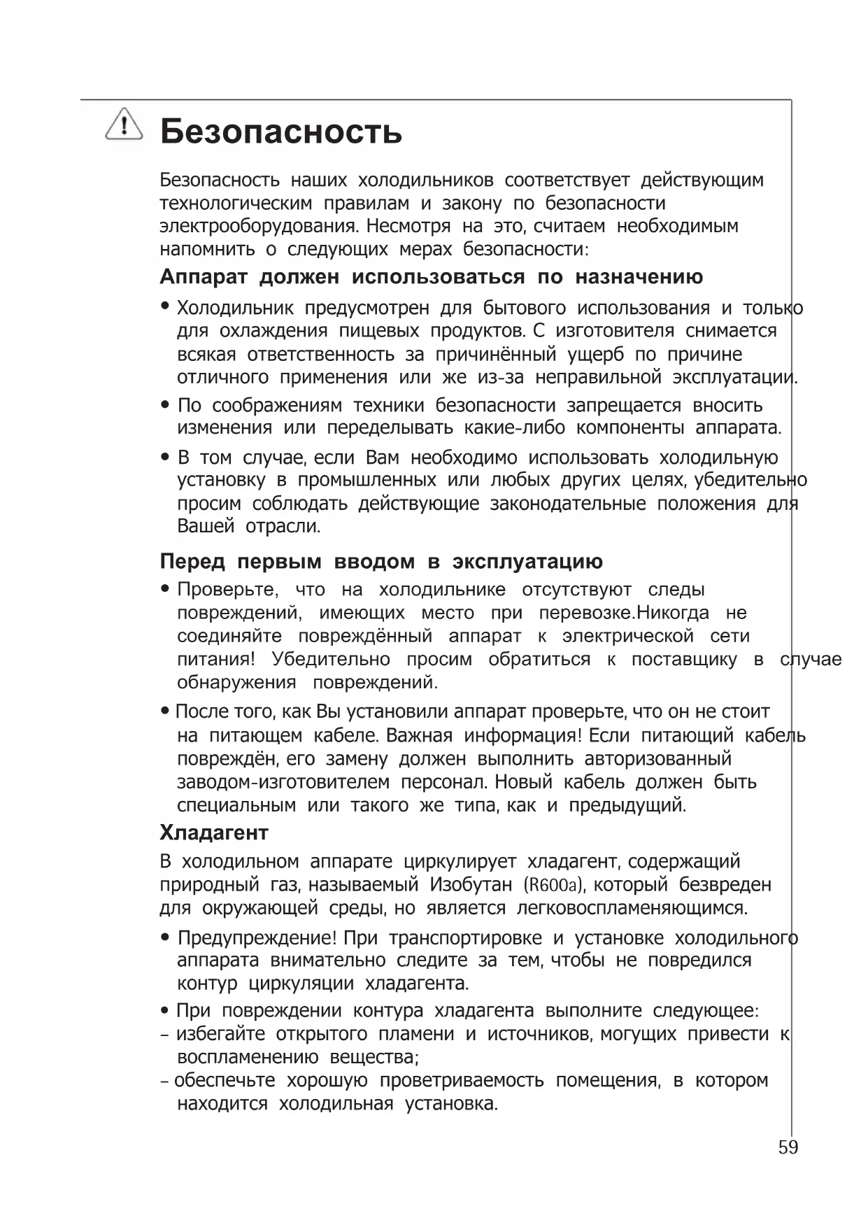 - Технические термины Безопасность Безопасность наших холодильников соответствует действующим технологическим правилам и закону по безопасности электрооборудования. Несмотря на это, считаем необходимым напомнить о следующих мерах безопасности: Аппарат должен использоваться по назначению p. 7559