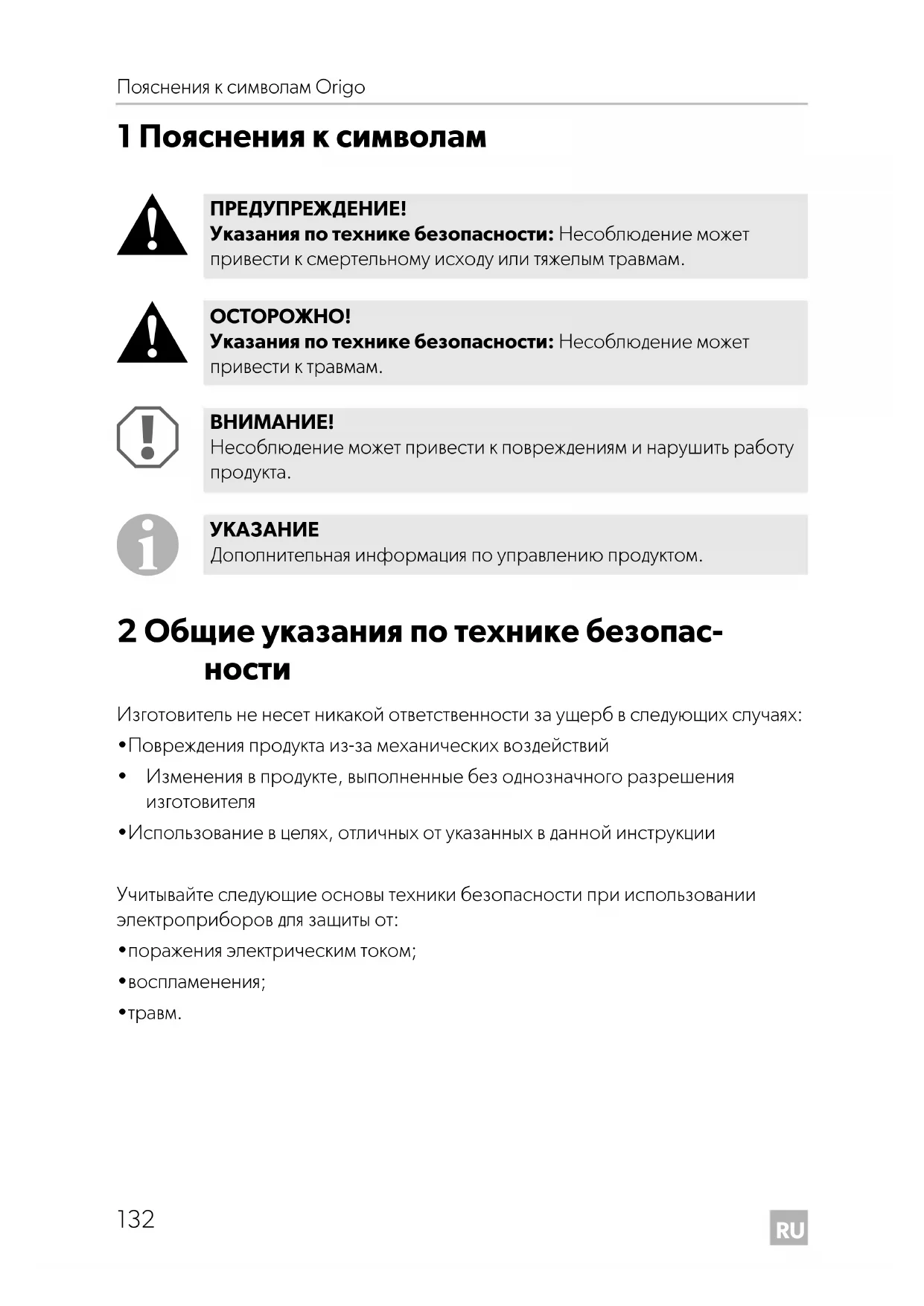 Origo_2000_4100.book Seite 132 Freitag, 6. Januar 2017 11:40 11RU Origo Общие указания по технике безопасности