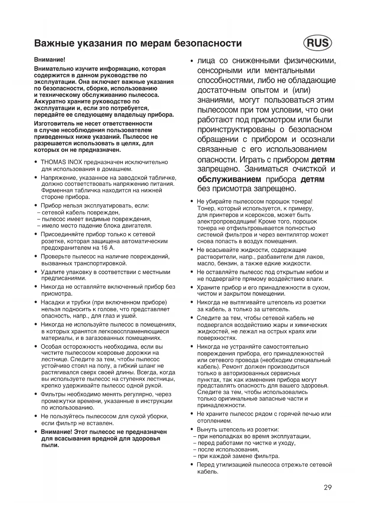 РУКОВОДСТВО ПОЛЬЗОВАТЕЛЯ INOX 1520 Plus THOMAS