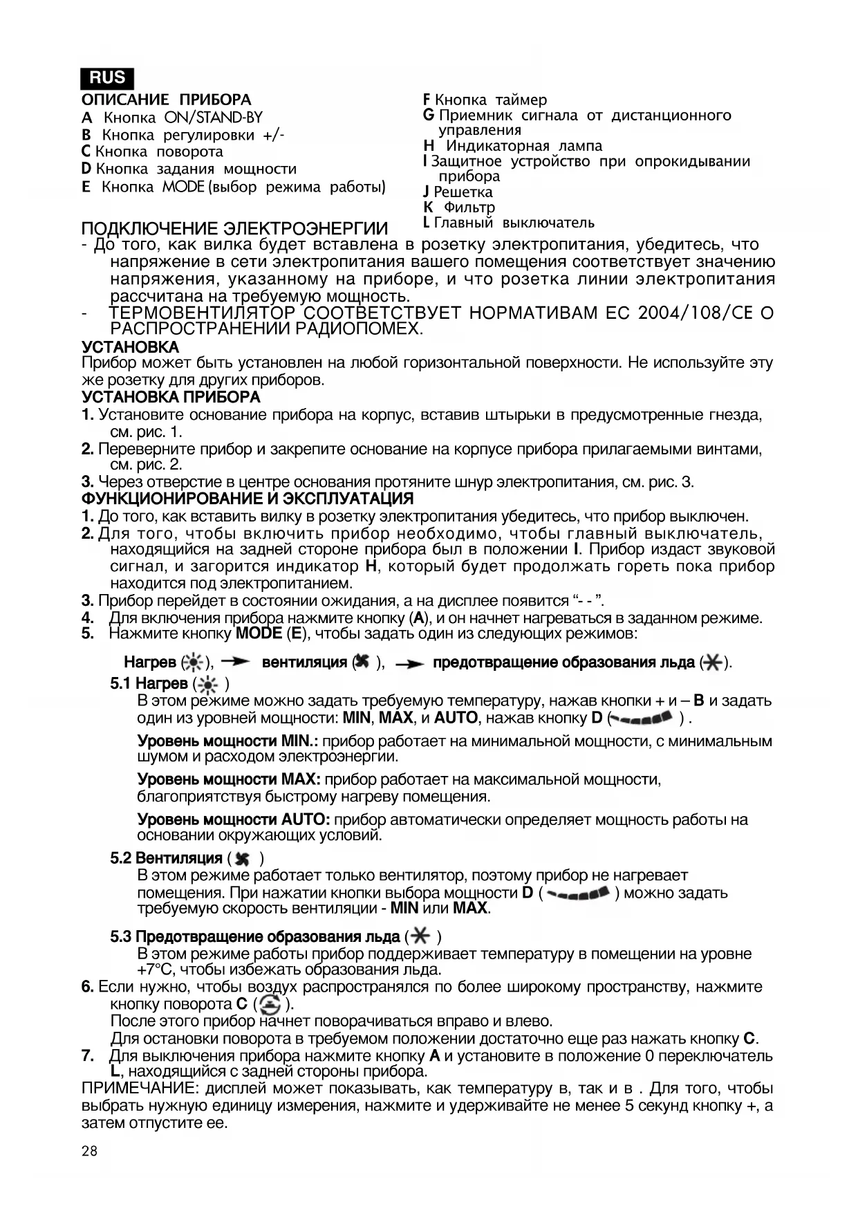 Е Кнопка MODE (выбор режима работы)