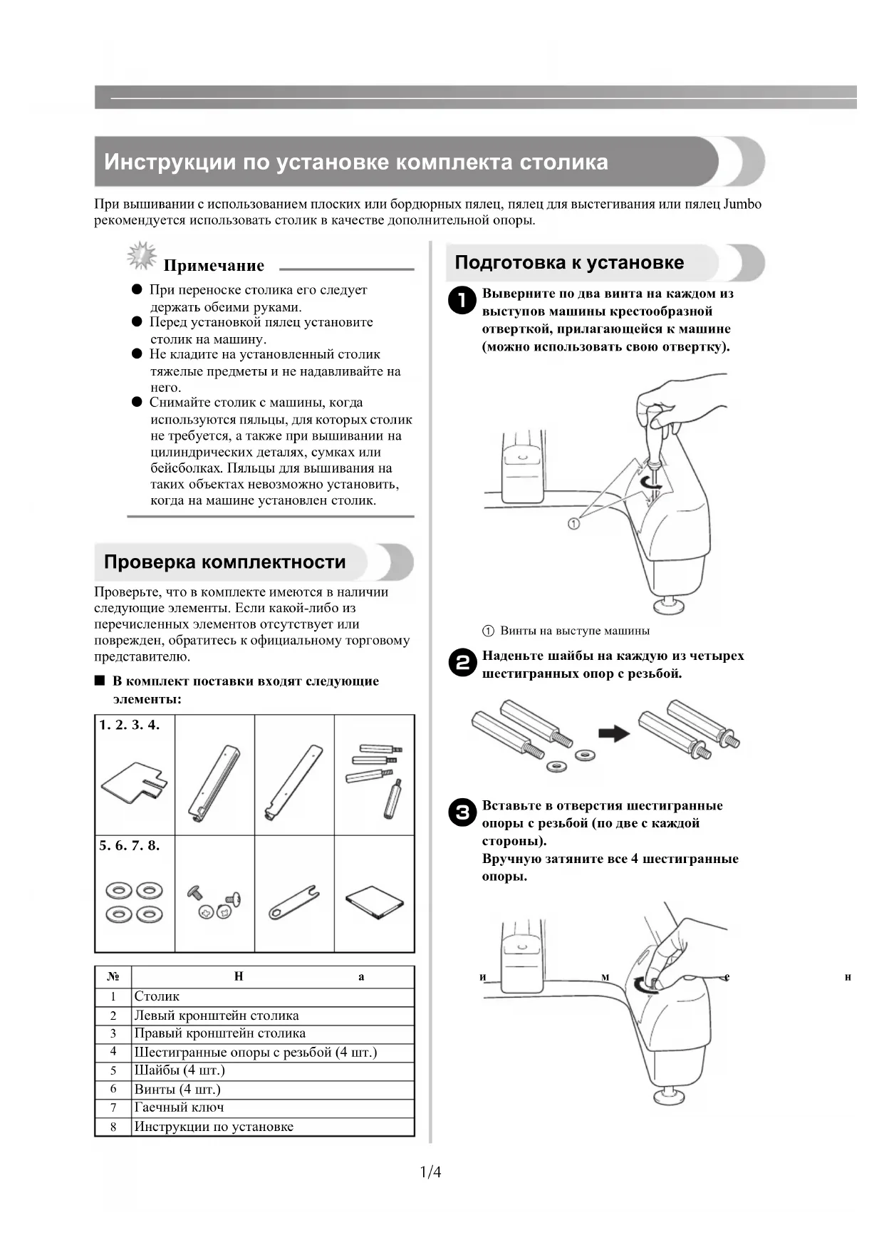 Инструкции по установке комплекта столика