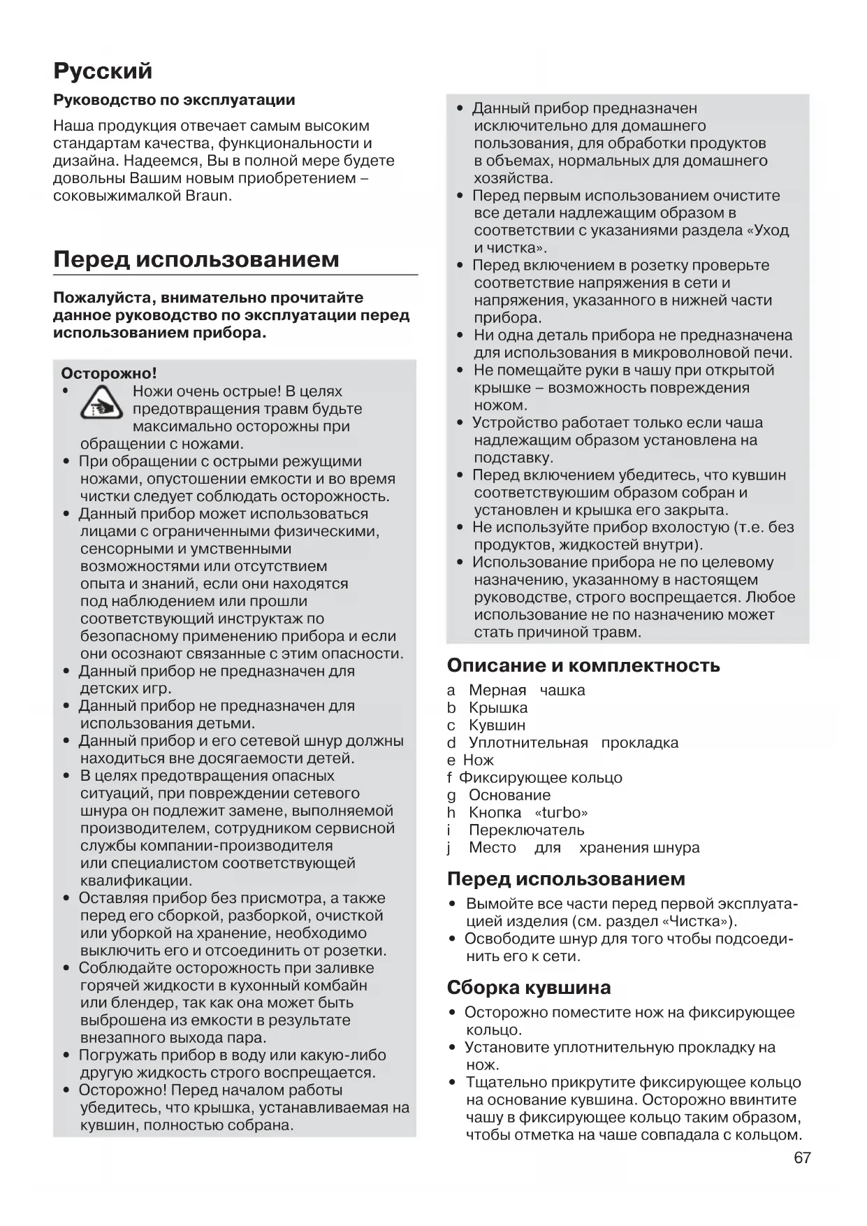Руководство по эксплуатации Наша продукция отвечает самым высоким стандартам качества, функциональности и дизайна. Надеемся, Вы в полной мере будете довольны Вашим новым приобретением – соковыжималкой Braun. Перед использованием Пожалуйста, внимательно прочитайте данное руководство по эксплуатации перед использованием прибора.