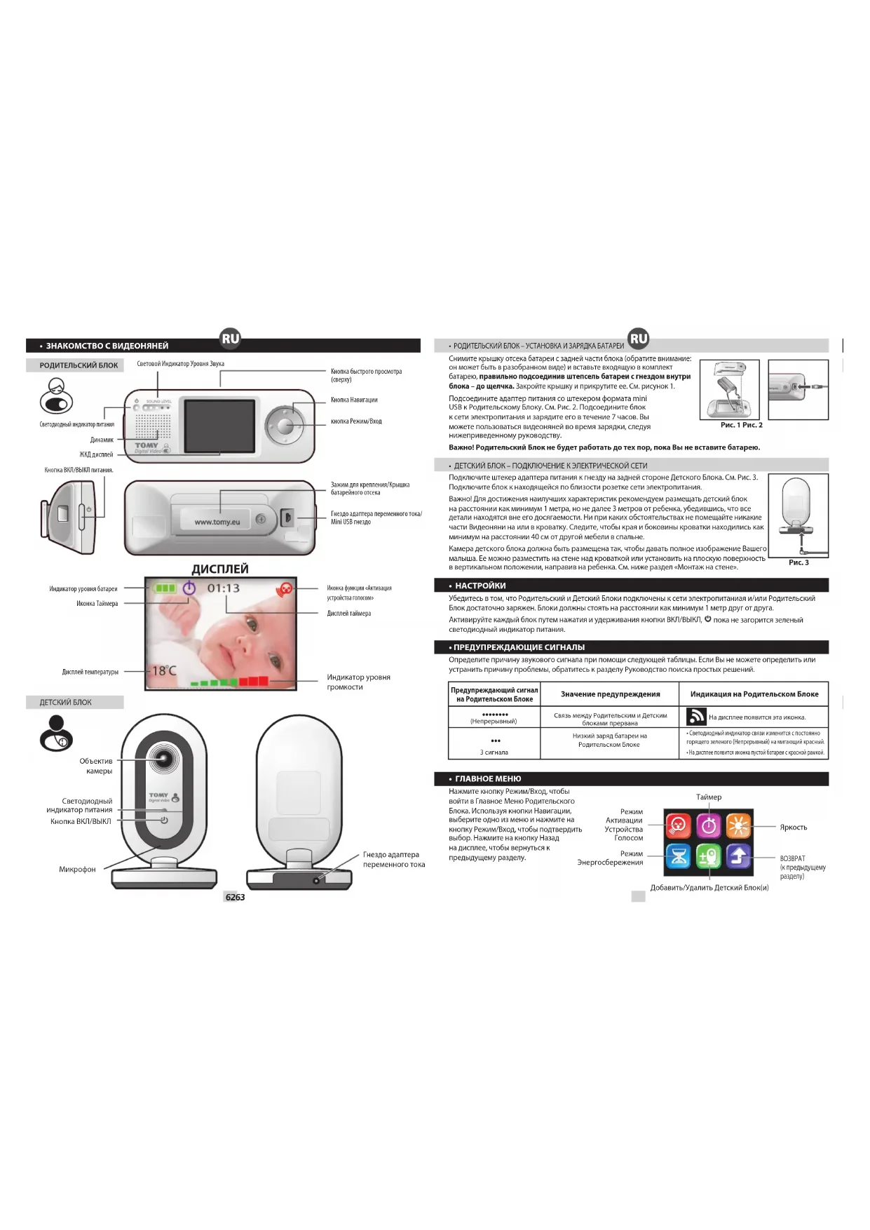 - ИНФОРМАЦИЯ ПО ТЕХНИКЕ БЕЗОПАСНОСТИ ВАЖНО! Данная Видеоняня предназначена только для использования в помещении! Видеоняня Tomy предназначена только для того, чтобы помочь вам следить за ребенком, она не заменяет собой полноценный присмотр взрослых! Изделие не предназначено для игр. Всегда держите электрические детали и кабели вне досягаемости маленьких детей. Не устанавливайте никакие части Видеоняни в/на детской кроватке. Убедитесь, что все провода расположены безопасно, так, что дети не смогут запутаться, и нет опасности отключения. Не используйте блоки питания от Видеоняни с любым другим оборудованием. Не используйте с Видеоняней другие блоки питания, кроме блоков питания из комплекта поставки. Во избежание поломок и телесных повреждений не надавливайте на подключенный блок питания! Зарядные устройства при использовании могут нагреваться – обращайтесь с ними осторожно, дайте остыть. НЕ НАКРЫВАЙТЕ Родительский и Детский блоки! Отключайте зарядное устройство, если не собираетесь пользоваться изделием несколько дней. Во избежание поражения электрическим током отключайте изделие от блока питания перед уборкой. Аккумуляторы родительского блока подлежат переработке. Не выбрасывайте их с обычным мусором. Не пытайтесь демонтировать какие-либо части изделия самостоятельно.