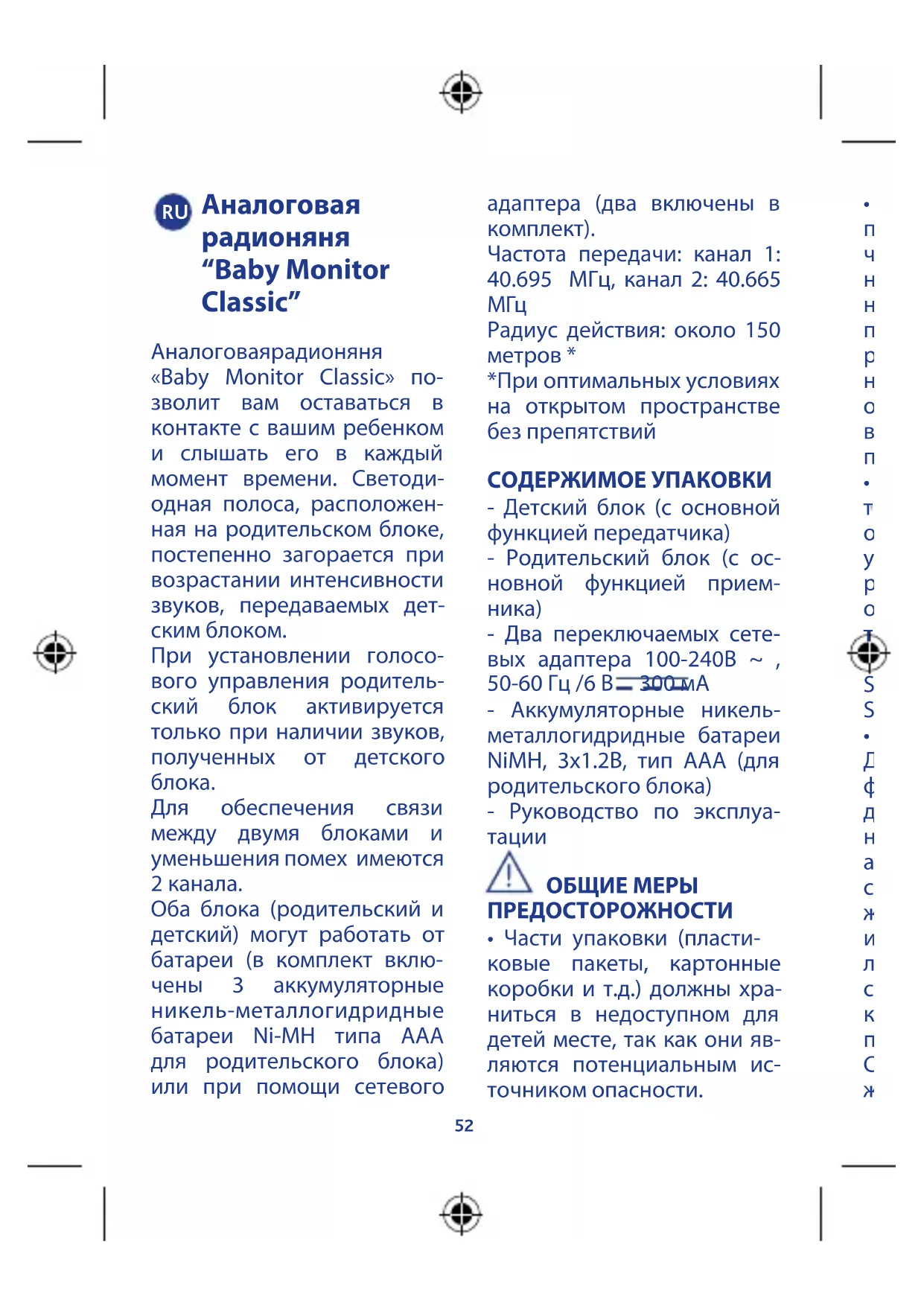 Предупреждение: эти операции должны выпол- няться только взрослыми Внимание: РЕКОМЕН- ДАЦИИ ПО ИСПОЛЬЗОВА- НИЮ БАТАРЕЙ - Использовать только ще- лочные батареи 1.5В типа AAA (не входят в комплект поставки) для детского бло- ка (с основной функцией передатчика) и аккумуля- торные никель-металло- гидридные NiMH батареи для родительского блока (с основной функцией прием- ника) с кодом 20256300100. - Всегда удалять щелочные батареи 1.5В типа AAA (не входят в комплект постав- ки) и/или аккумуляторные батареи, если они разряже- ны и/или в случае, если ро- дительский и детский блоки не будут использоваться в течение длительного пери- ода времени. Это необхо- димо для предотвращения утечек из батарей содер- жащейся в них жидкости, которая может повредить приборы и/или находящи- еся рядом предметы. - Не замыкать накоротко полюсы батарей. - Не рекомендуется ис- пользовать аккумулятор- ные батареи для детского блока, так как они могут уменьшить функциональ- ность прибора. Детский блок не предназначен для работы с аккумуляторными батареями. Использовать только щелочные батареи 1.5В типа AAA (не входят в комплект поставки). ПРИМЕЧАНИЕ: если время работы заряженных акку- муляторных батарей, по- ставляемых в комплекте с родительским блоком, зна- чительно уменьшается - это означает, что их ресурс вы- работан, поэтому необхо- димо заменить их (данный факт считается нормаль- ным, так как аккумулятор- ные батареи со временем вырабатывают ресурс) - Аккумуляторные батареи,64
