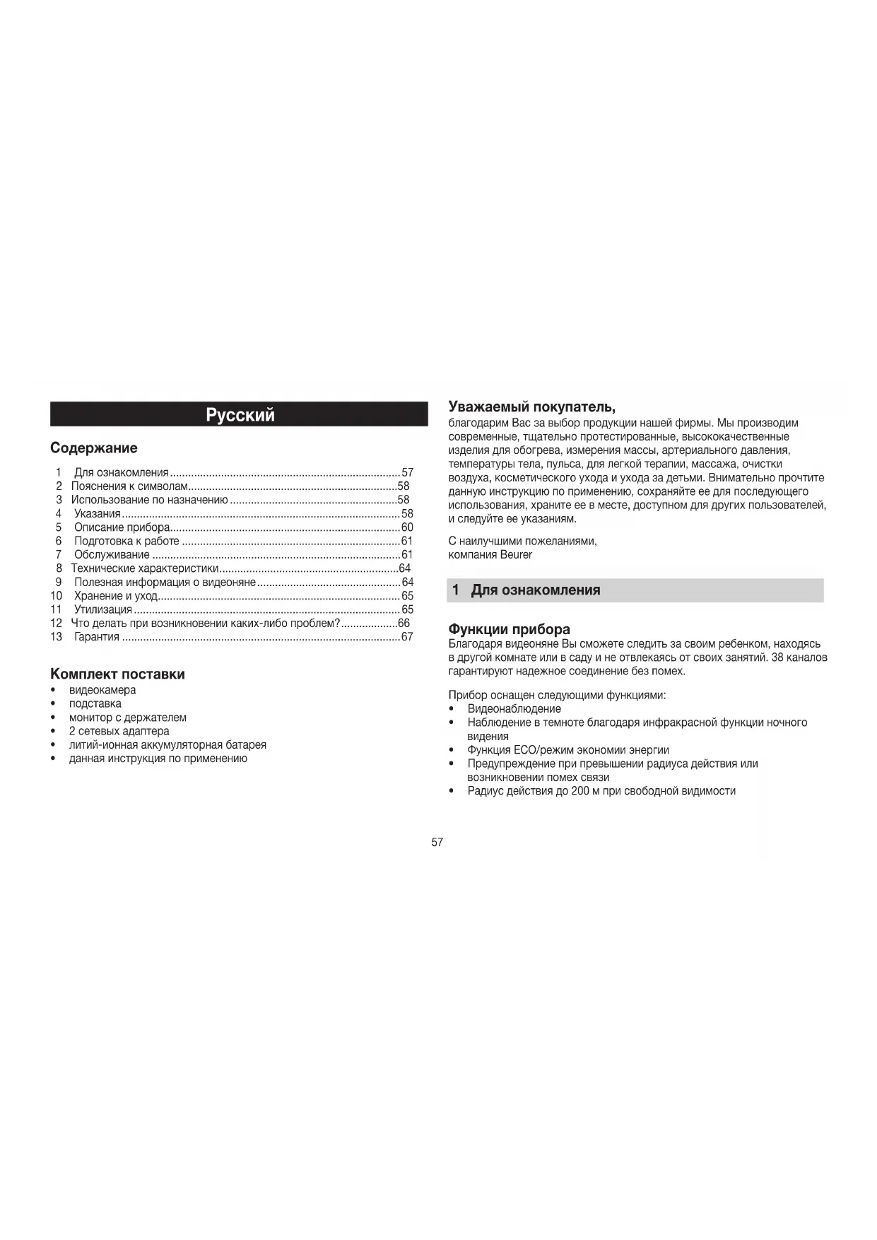 - Проверьте, находятся ли видеокамера и монитор в зоне приема. Если передача изображения с видеокамеры невозможна, Вы можете заново синхронизировать цифровые сигналы приборов = pairing («синхронизация»). Включите оба прибора. Откройте строку меню, нажав кнопку «ОК/ Меню». Выберите пункт меню setting («Системные настройки»), а затем register («Регистрация»). Выберите нужный номер канала (если Вы используете видеоняню только с одной камерой, это будет канал № 1). Еще раз нажмите кнопку «ОК/ Меню». Удерживайте кнопку установления связи на камере нажатой в течение примерно 3секунд. После успешного установления связи с камерой дважды нажмите кнопку «ВКЛ./ВЫКЛ.», чтобы перейти к передаче изображения.67 Настоящим мы гарантируем, что данное изделие соответствует европейской директиве R&TTE (Директива ЕС по средствам радиосвязи и телекоммуникационному оконечному оборудованию) 1999/5/EC. Обратитесь в сервисный центр по указанному адресу для получения подробных сведений— например, о соответствии директивам ЕС. 13 Гарантия Мы предоставляем гарантию на дефекты материалов и изготовления этого прибора на срок 24 месяца со дня продажи через розничную сеть. Гарантия не распространяется: – на случаи ущерба, вызванного неправильным использованием, – на быстроизнашивающиеся части (батарейки), – на дефекты, о которых покупатель знал в момент покупки, – на случаи собственной вины покупателя. Товар сертифицирован: видео-, радионяни для контроля за детьми –“ВСЦ МИРАТЕКС “ № РОСС DE.AB 02.B04117 срок действия с 11.02.2011 по 10.02.2014гг. Срок эксплуатации изделия: мин. 5 лет Фирма-изготовитель: Бойрер Гмбх, Софлингер штрассе 218, 89077-УЛМ, Германия Фирма-импортер: OOO БОЙРЕР, 109451 г. Москва, ул. Перерва, 62,корп.2, офис 3 Сервисный центр: 109451 г. Москва, ул. Перерва, 62, корп.2 Тел(факс) 495–658 54 90 bts-service@ctdz.ru AB 02 Дата продажи Подпись продавца Штамп магазина Подпись покупателя68 69 Szanowna Klientko, szanowny Kliencie! Cieszymy się, że wybrali Państwo nasz produkt. Firma Beurer oferuje dokładnie przetestowane, wysokiej jakości produkty przeznaczone do ogrze- wania, pomiaru wagi, ciśnienia krwi, temperatury i tętna, a także przyrządy do łagodnej terapii, pielęgnacji urody, masażu i uzdatniania powietrza oraz urządzenia ułatwiające opiekę nad dziećmi. Należy dokładnie przeczytać i zachować niniejszą instrukcję obsługi, przechowywać ją w miejscu dostępnym dla innych użytkowników i przestrzegać podanych w niej wskazówek. Z poważaniem Zespół Beurer 1 Informacje ogólne Funkcje urządzenia Niniejsze urządzenie pozwala na obserwowanie dziecka przy jednoczesnym wykonywaniu prac w innych pomieszczeniach lub w ogrodzie. Zastosowanie 38 kanałów gwarantuje maksymalnie bezpieczne i pozbawione zakłóceń połączenie. Urządzenie jest wyposażone w następujące funkcje: