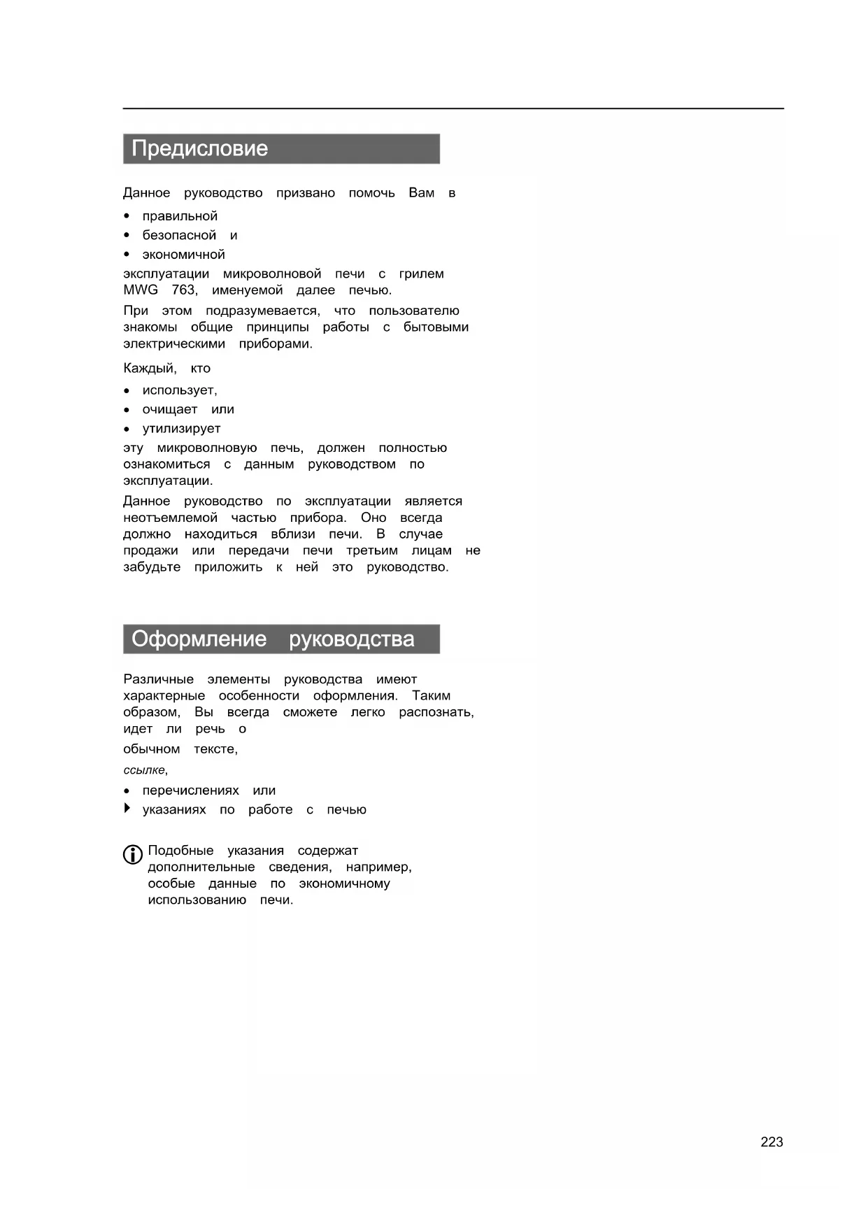 утилизирует эту микроволновую печь, должен полностью ознакомиться с данным руководством по эксплуатации. Данное руководство по эксплуатации является неотъемлемой частью прибора. Оно всегда должно находиться вблизи печи. В случае продажи или передачи печи третьим лицам не забудьте приложить к ней это руководство. Оформление руководства Различные элементы руководства имеют характерные особенности оформления. Таким образом, Вы всегда сможете легко распознать, идет ли речь о обычном тексте, DDEFGH