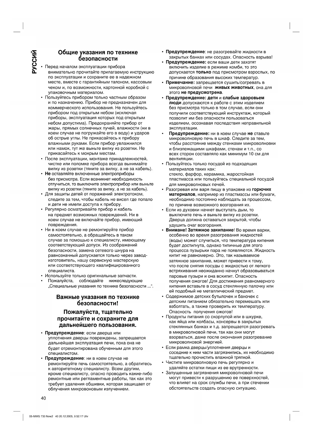 - Запущенные загрязнения микроволновой печи могут привести к разрушению ее поверхностей, что влияет на срок службы печи, а при стечении обстоятельств создать опасную ситуацию. 05-MWG 733 New2 40 20.12.2005, 9:52:17 UhrРУССИЙ