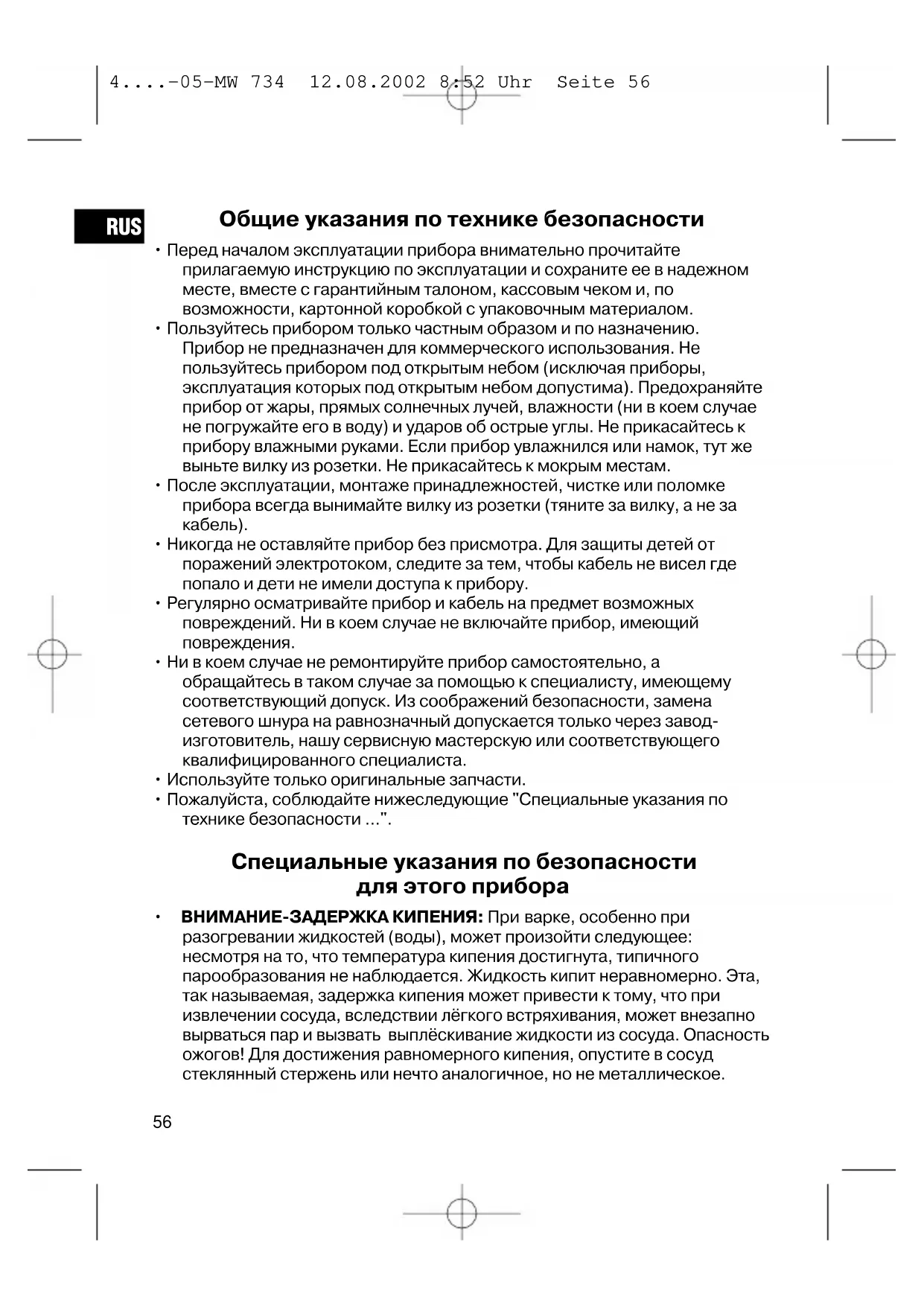 RUS 4....-05-MW 734 12.08.2002 8:52 Uhr Seite 56• Ни в коем случае не разогревайте жидкости в закрытой упаковке. Взрывоопасно!