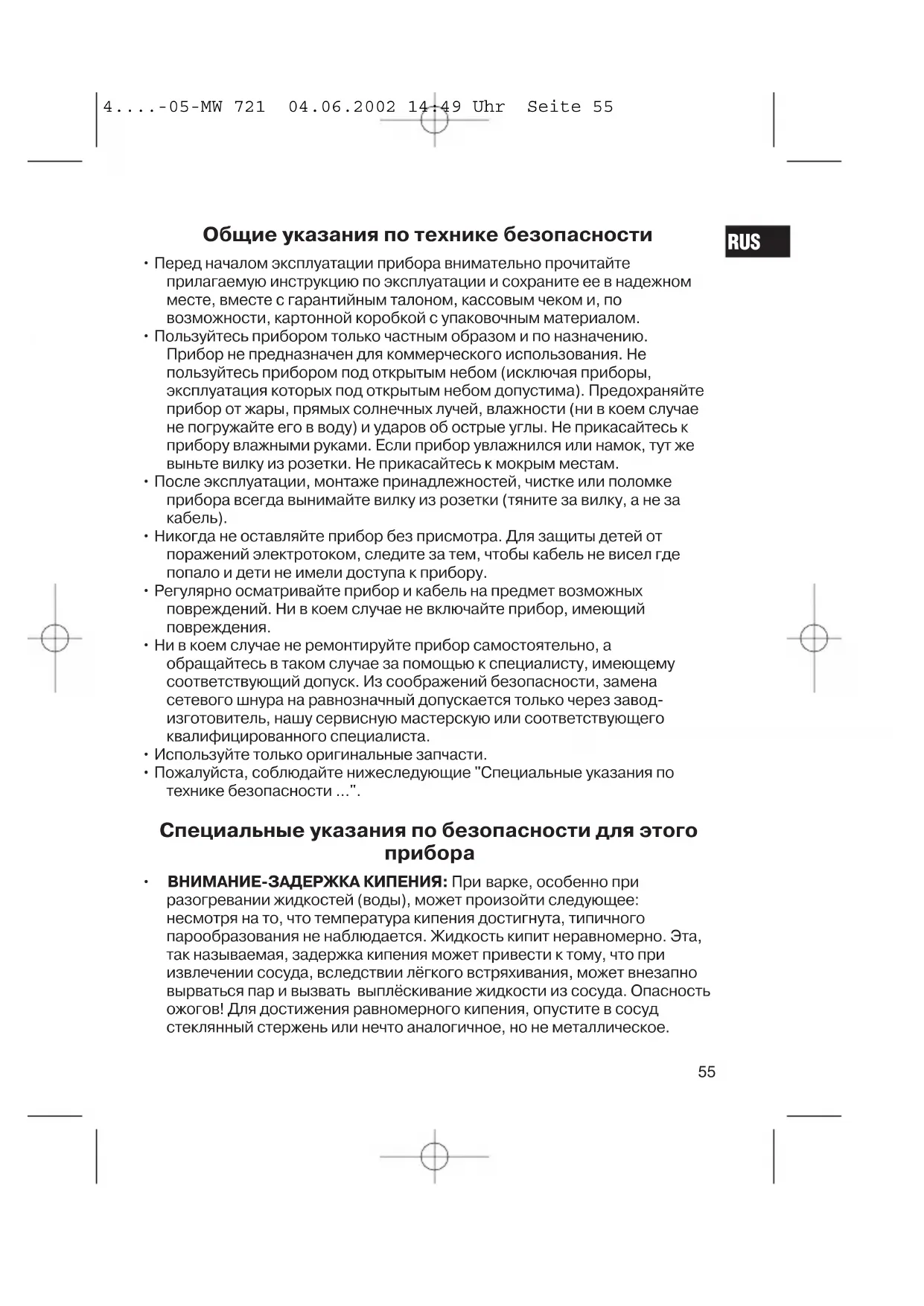 RUS 4....-05-MW 721 04.06.2002 14:49 Uhr Seite 55• Ни в коем случае не разогревайте жидкости в закрытой упаковке. Взрывоопасно!