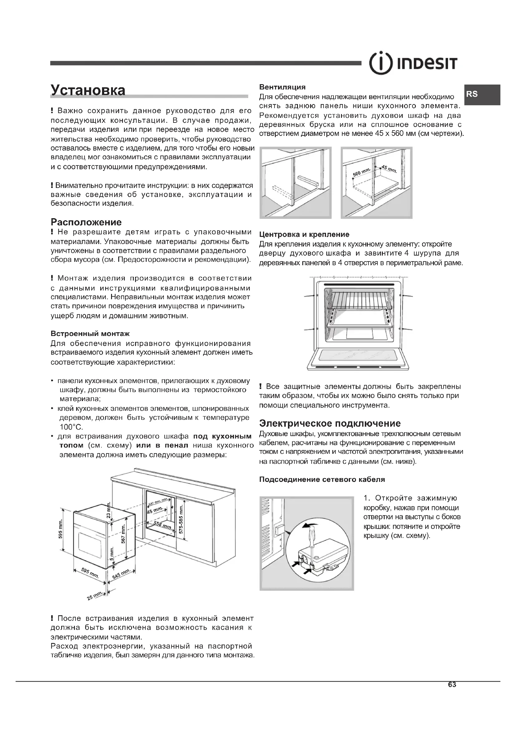 ! Важно сохранить данное руководство для его последующих консультации. В случае продажи, передачи изделия или при переезде на новое место жительства необходимо проверить, чтобы руководство оставалось вместе с изделием, для того чтобы его новыи владелец мог ознакомиться с правилами эксплуатации и с соответствующими предупреждениями. ! Внимательно прочитаите инструкции: в них содержатся важные сведения об установке, эксплуатации и безопасности изделия. Расположение ! Не разрешаите детям играть с упаковочными материалами. Упаковочные материалы должны быть уничтожены в соответствии с правилами раздельного сбора мусора (см. Предосторожности и рекомендации). ! Монтаж изделия производится в соответствии с данными инструкциями квалифицированными специалистами. Неправильныи монтаж изделия может стать причинои повреждения имущества и причинить ущерб людям и домашним животным. Встроенный монтаж Для обеспечения исправного функционирования встраиваемого изделия кухонный элемент должен иметь соответствующие характеристики: