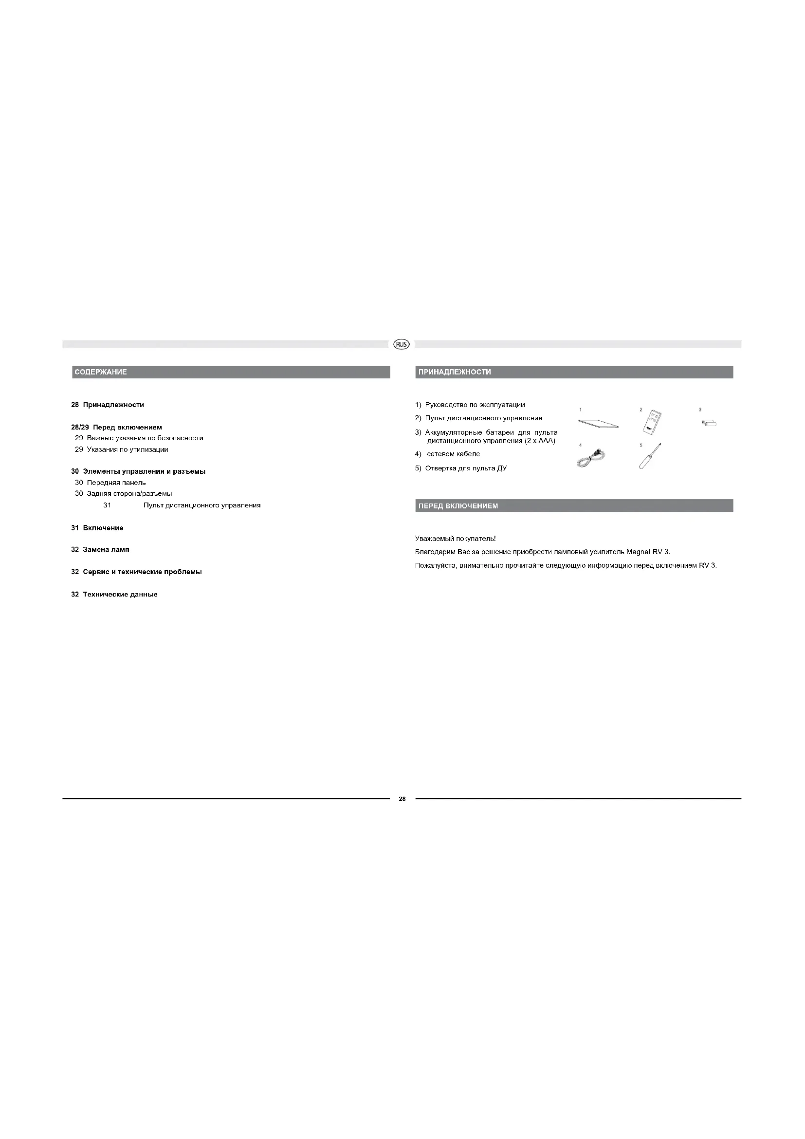 ПЕРЕД ВКЛЮЧЕНИЕМ Уважаемый покупатель! Благодарим Вас за решение приобрести ламповый усилитель Magnat RV 3. Пожалуйста, внимательно прочитайте следующую информацию перед включением RV 3.29