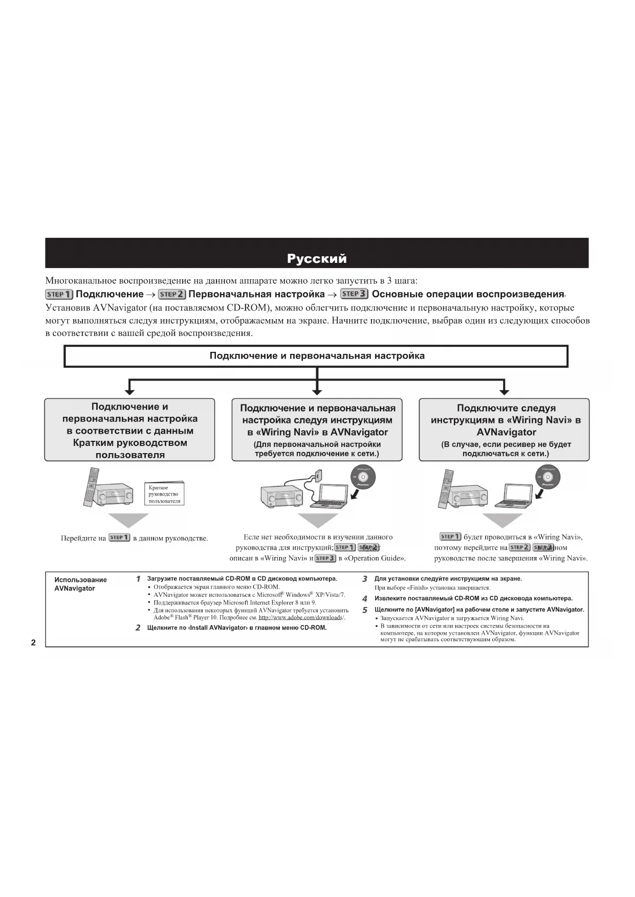 Подключение и первоначальная настройка следуя инструкциям в «Wiring Navi» в AVNavigator (Для первоначальной настройки требуется подключение к сети.) Подключите следуя инструкциям в «Wiring Navi» в AVNavigator (В случае, если ресивер не будет подключаться к сети.) Подключение и первоначальная настройка в соответствии с данным Кратким руководством пользователя Есле нет необходимости в изучении данного руководства для инструкций;