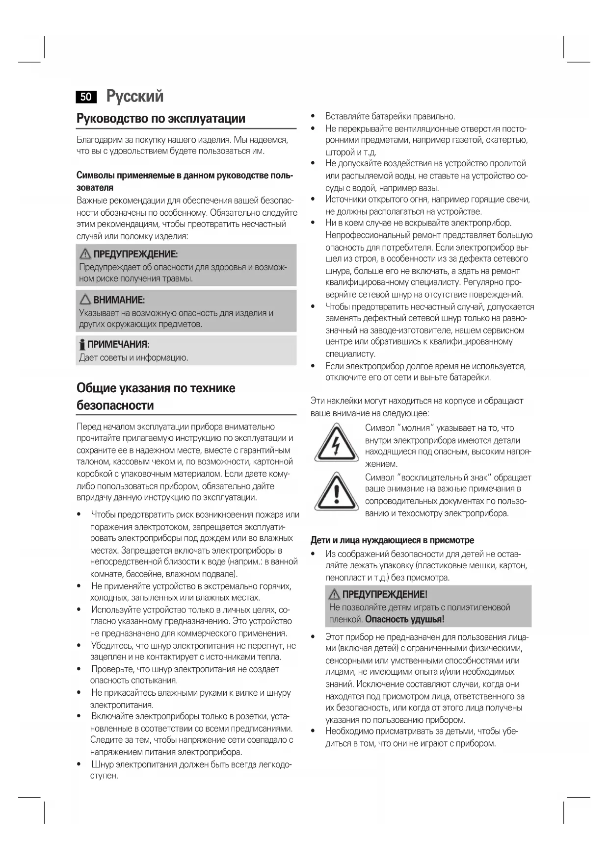 - Еслиэлектроприбордолгоевремянеиспользуется, отключите его от сети и выньте батарейки. Эти наклейки могут находиться на корпусе и обращают вашевниманиенаследующее: Символ”молния“указываетнато,что внутри электроприбора имеются детали находящиеся под опасным, высоким напря-